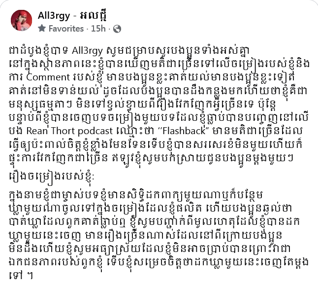ដូចដែលបងប្អូនបានដឹងកន្លងមកហើយ ថាខ្ញុំគឺជាមនុស្សធម្មតាៗ មិនទៅខ្វល់ខ្វាយពីរឿងវែកញែកអ្វីច្រើនទេ ប៉ុន្តែបន្ទាប់ពីខ្ញុំបានចេញបទចម្រៀងមួយបទ ដែលខ្ញុំធ្លាប់បានបញ្ចេញនៅលើបង Rean Thort podcast ឈ្មោះថា «Flashback» មានមតិជាច្រើន ដែលធ្វើឱ្យប៉ះពាល់ចិត្តខ្ញុំខ្លាំងមែនទែន ទើបខ្ញុំបានសរសេរខំមិនមួយ ហើយក៏ផ្ទុះការវែកញែកជាច្រើន ឥឡូវខ្ញុំសូមបកស្រាយជូនបងប្អូនម្ដងមួយៗ។