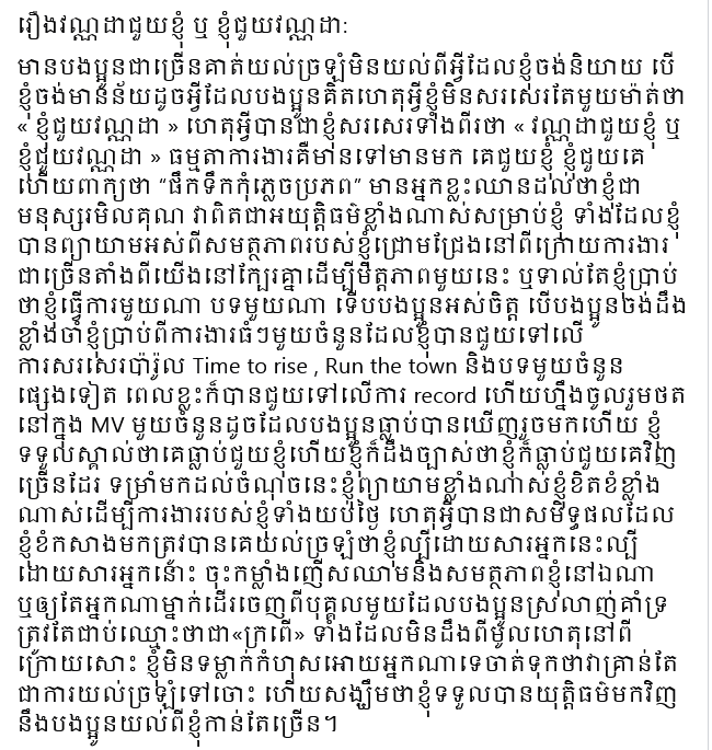– រឿង វណ្ណដាជួយខ្ញុំ ឬ ខ្ញុំជួយវណ្ណដា៖ មានបងប្អូនជាច្រើនគាត់យល់ច្រឡំ មិនយល់ពីអ្វី ដែលខ្ញុំចង់និយាយ បើខ្ញុំចង់មានន័យដូចអ្វី ដែលបងប្អូនគិតហេតុអ្វីខ្ញុំមិនសរសេរតែមួយម៉ាត់ថា «ខ្ញុំជួយវណ្ណដា » ហេតុអ្វីបានជាខ្ញុំសរសេរទាំងពីរថា « វណ្ណដា ជួយខ្ញុំ ឬ ខ្ញុំជួយ វណ្ណដា» ធម្មតាការងារ គឺមានទៅមានមក គេជួយខ្ញុំ ខ្ញុំជួយគេ ហើយពាក្យថា «ផឹកទឹកកុំភ្លេចប្រភព» មានអ្នកខ្លះឈានដល់ថា ខ្ញុំជាមនុស្សរមិលគុណ វាពិតជាអយុត្តិធម៌ខ្លាំងណាស់សម្រាប់ខ្ញុំ ទាំងដែលខ្ញុំបានព្យាយាមអស់ពីសមត្ថភាពរបស់ខ្ញុំ ជ្រោមជ្រែងនៅពីក្រោយការងារជាច្រើនតាំងពីយើងនៅក្បែរគ្នា ដើម្បីមិត្តភាពមួយនេះ ឬទាល់តែខ្ញុំប្រាប់ថាខ្ញុំ ធ្វើការមួយណា បទមួយណា ទើបបងប្អូនអស់ចិត្ត បើបងប្អូនចង់ដឹងខ្លាំងចាំខ្ញុំប្រាប់ពីការងារធំៗមួយចំនួន ដែលខ្ញុំបានជួយទៅលើការសរសេរប៉ារ៉ូល Time to rise , Run the town និង បទមួយចំនួនផ្សេងទៀត ពេលខ្លះក៏បានជួយទៅលើការ record ហើយនឹងចូលរួមថតនៅក្នុង MV មួយចំនួនដូចដែលបងប្អូនធ្លាប់បានឃើញរួចមកហើយ។