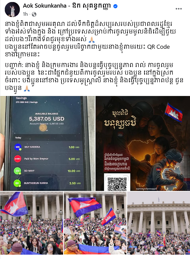 កាយនៅអូស្រ្តាលី តែបេះដូងនៅខ្មែរ! ឱក សុគន្ធកញ្ញា បន្តយ៉ាងសកម្ម ប្រមូលថវិកាជូនដល់វីរកងទ័ពជួរមុខ