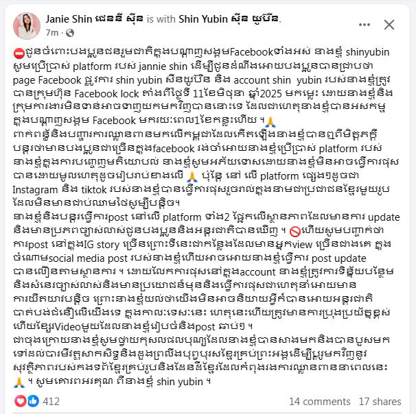 ក្រោយរងការវែកញែកខ្លាំងពីមហាជន មកដល់ថ្មីៗនេះ ក៏បានឃើញហ្វេសប៊ុកផេករបស់កញ្ញា ស៊ីន ជេននី ដែលជាប្អូនស្រីរបស់តារាស្រីរូបនេះ បានបង្ហោះសារជូនដំណឹងមួយ ដោយបញ្ជាក់ថាជាកញ្ញា ស៊ីន យូប៊ីន បង្ហោះឡើងក្នុងគោលបំណងបកស្រាយ និង ជូនជាដំណឹងពីមូលហេតុដែលនាងស្ងាត់ ដោយសារតែហ្វេសប៊ុកផេក និង គណនីហ្វេសប៊ុករបស់នាង ត្រូវបានក្រុមហ៊ុនហ្វេសប៊ុក Lock Account តាំងពីថ្ងៃទី ១១ ខែមិថុនា ឆ្នាំ ២០២៥ កន្លងទៅម្ល៉េះ។
