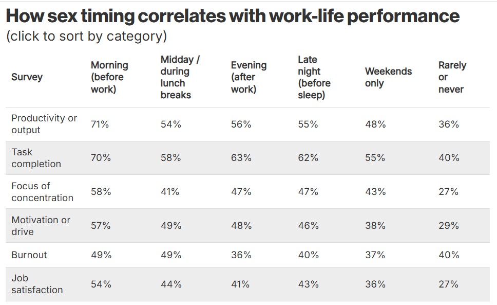 ជាក់ស្តែង បើតាមការសិក្សារបស់អ្នកនិពន្ធសម្រាប់គេហទំព័រ ZipHealth ដែលជាឱសថស្ថានអនឡាញ បានបង្ហាញការរកឃើញនៅក្នុងខែតុលា ឆ្នាំ ២០២៥ យ៉ាងដូច្នេះ៖ ពលរដ្ឋអាមេរិកអ្នកធ្វើការពេញម៉ោង ដែលបានរួមភេទនៅពេលព្រឹកមុនទៅធ្វើការ ពួកគេមានផលិតភាពការងារខ្ពស់ដល់ទៅ ៧១%, អាចបញ្ចប់ភារកិច្ចលឿន ៧០%, ផ្តោតអារម្មណ៍ ៥៨%, មានកម្លាំងជំរុញចិត្ត ៥៧ % និង រីករាយនឹងការងារ ៥៤%។