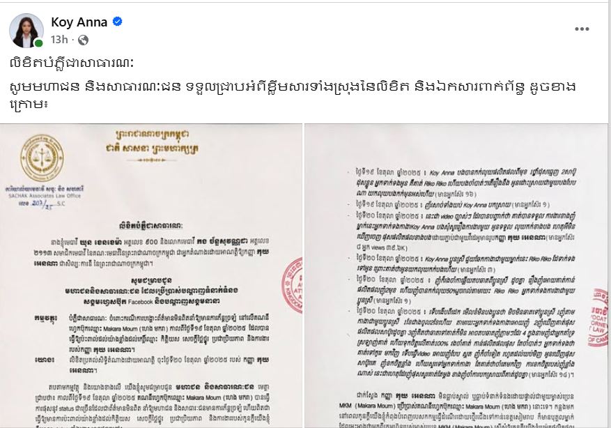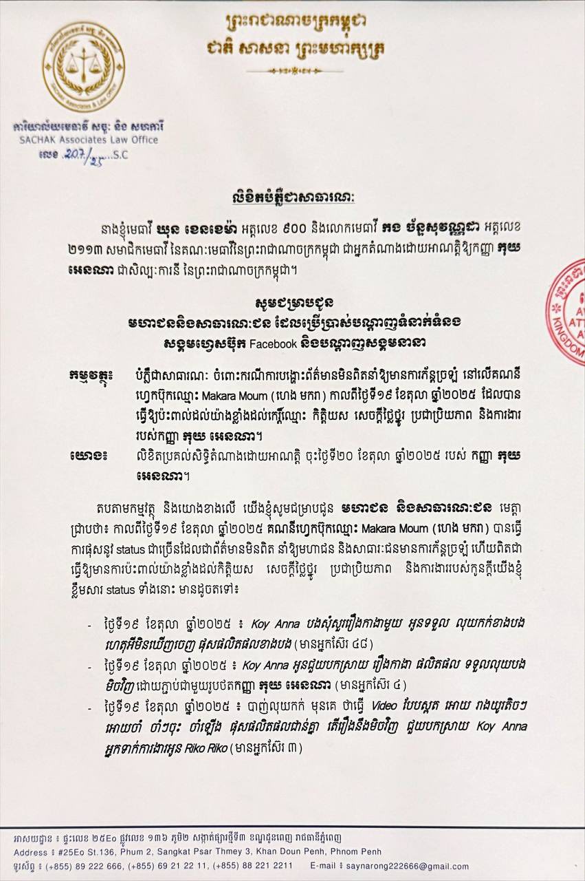 ចំពោះការចេញលិខិតបំភ្លឺជាសាធារណៈនេះ បវរកញ្ញា កុយ អេនណា បានធ្វើឡើង ក្រោយមានគណនីហ្វេសប៊ុកមួយឈ្មោះ Makara Moum បានបង្ហោះនូវ Status ជាច្រើន កាលពីថ្ងៃទី ១៩ ខែតុលា ឆ្នាំ ២០២៥ កន្លងទៅនេះ ដែលជាព័ត៌មានមិនពិតនាំឱ្យមហាជនមានការភាន់ច្រឡំ ដែលពិតជាធ្វើឱ្យមានការប៉ះពាល់យ៉ាងខ្លាំងដល់កិត្តិយស សេចក្ដីថ្លៃថ្នូរ ប្រជាប្រិយភាព និង ការងាររបស់នាង។