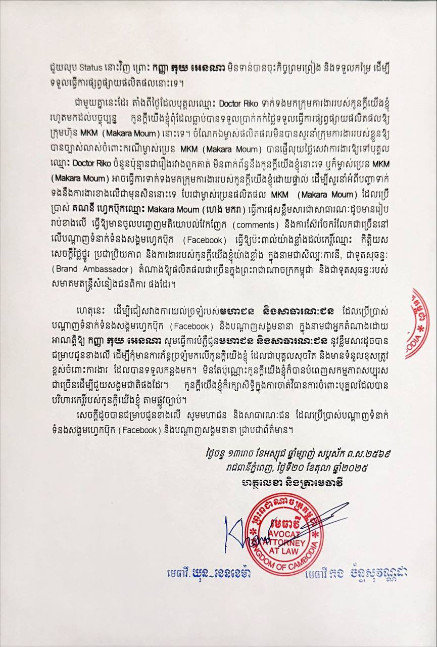 ក្នុងនោះដែរ កញ្ញា កុយ អេនណា ក៏បានបកស្រាយឱ្យដឹងថា នាងមិនធ្លាប់ស្គាល់ ឬធ្លាប់ទាក់ទងដោយផ្ទាល់ជាមួយម្ចាស់ប្រេន MKM ដែលមានគណនីហ្វេសប៊ុក Makara Moum នោះទេ។ លើសពីនេះ នាងក៏បានបញ្ជាក់ច្បាស់ៗថា កន្លងមកនាងពុំមានការចុះកិច្ចព្រមព្រៀងការងារ និង ទទួលកម្រៃ ដើម្បីទទួលការងារផ្សព្វផ្សាយផលិតផល ដូចដែលការបង្ហោះរបស់ម្ចាស់ប្រ៊េនរូបនោះលើកឡើងឡើយ៕