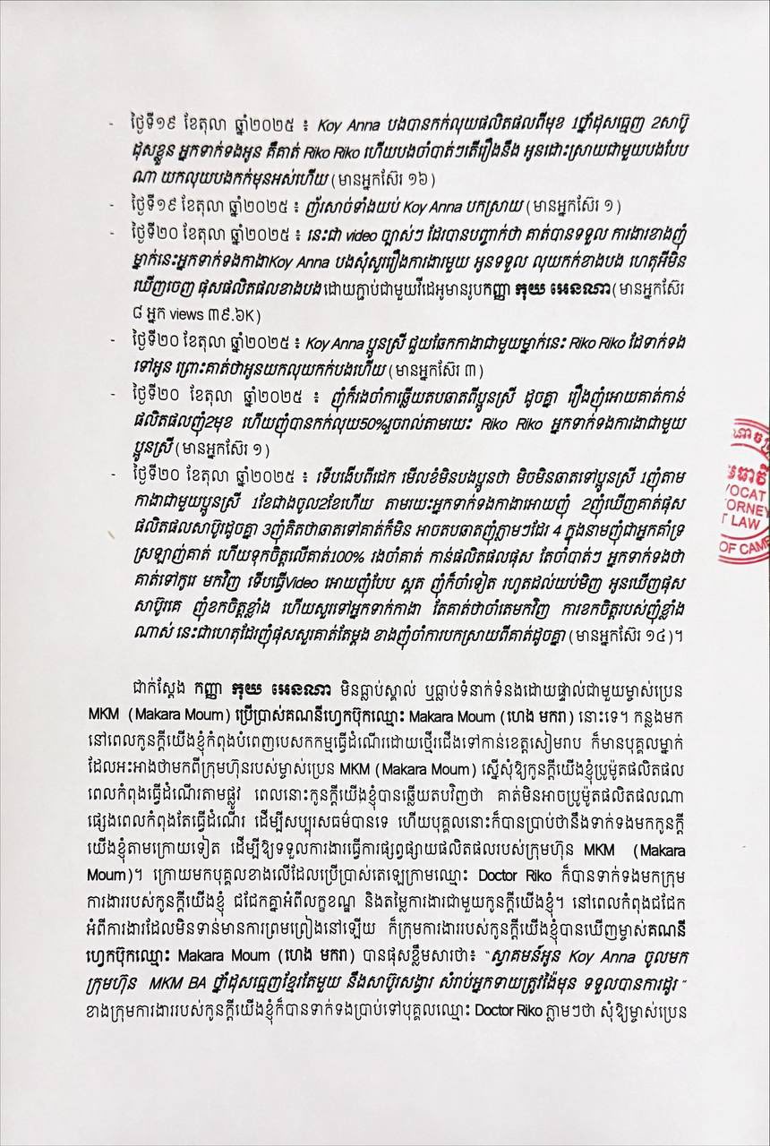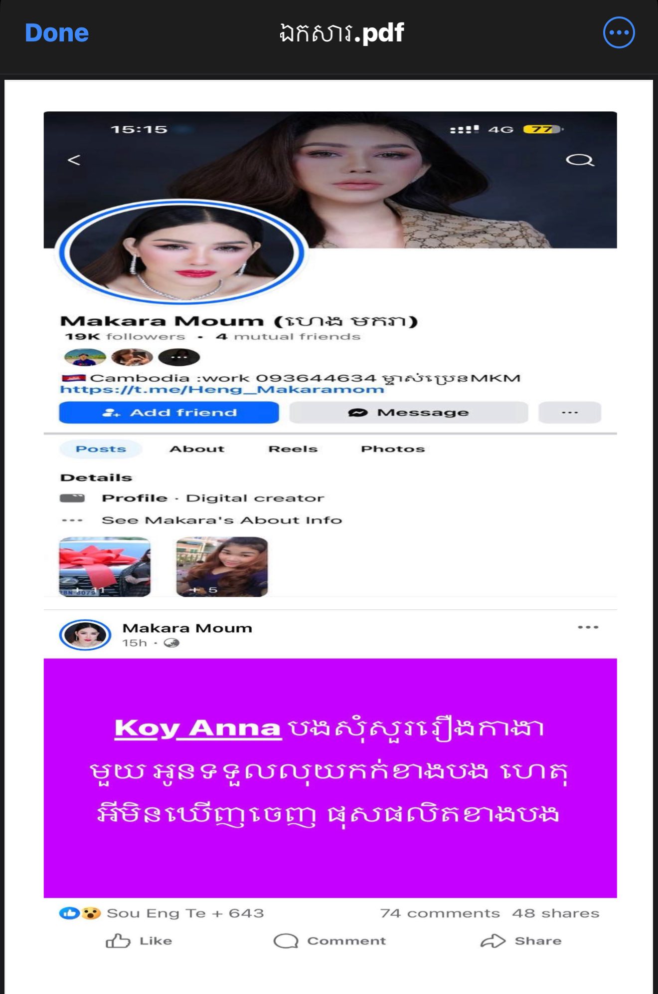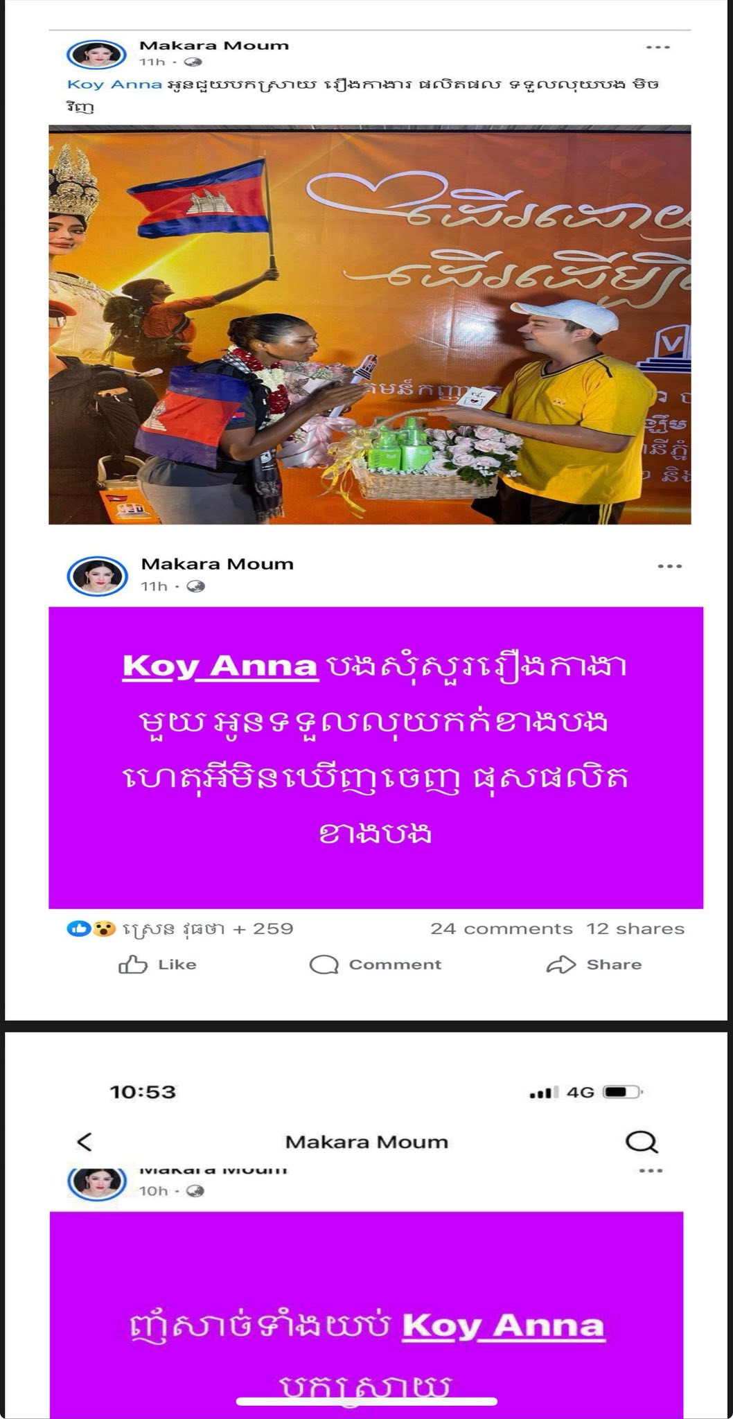 តាមរយៈលិខិតបំភ្លឺនេះបានឱ្យដឹងថា គណនីហ្វេសប៊ុក Makara Moum (ហេង មករា) បានបង្ហោះសារជាច្រើន ទាក់ទងនឹងការងារផ្សព្វផ្សាយផលិតផល ដោយបាននិយាយសំដៅលើបវរកញ្ញា កុយ អេនណា ថាទទួលធ្វើការងារផ្សព្វផ្សាយផលិតផលឱ្យក្រុមហ៊ុនរបស់ខ្លួន និង បានទទួលលុយកក់រួចហើយ តែមិនមានឃើញការបង្ហោះផ្សព្វផ្សាយផលិតឱ្យក្រុមហ៊ុន ជាហេតុធ្វើឱ្យគណនីហ្វេសប៊ុកខាងលើ បានបង្ហោះសារឱ្យកញ្ញា កុយ អេនណា និង អ្នកទាក់ទងការងារឈ្មោះ Riko Riko ចេញមកទទួលខុសត្រូវ។