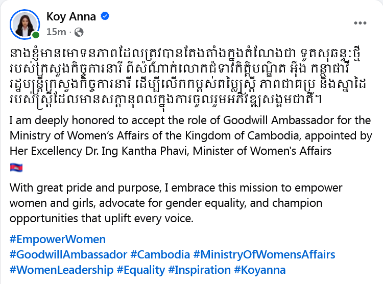 ដោយឡែក កាលពីពេលថ្មីៗនេះ កញ្ញា កុយ អេនណា ត្រូវបានក្រសួងកិច្ចការនារី បានតែងតាំងកញ្ញា ធ្វើជាទូតសុឆន្ទៈថ្មី ធ្វើឱ្យអ្នកគាំទ្របានបង្ហាញការអបអរ និង រំភើបចិត្តយ៉ាងខ្លាំង ខណៈតំណែងនេះ ពិតជាស័ក្តិសមសម្រាប់ការលះបង់របស់នាង។