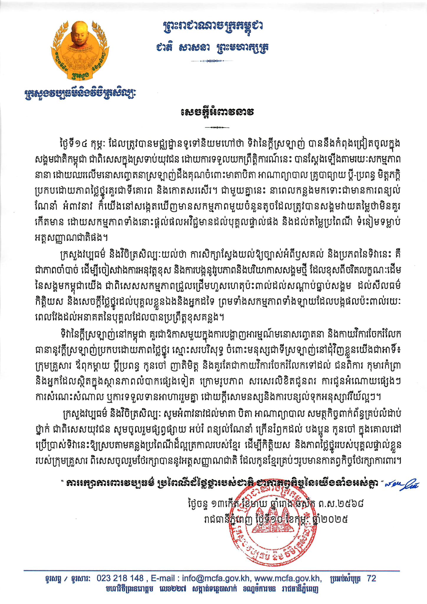 នៅថ្ងៃទី ១០ ខែកុម្ភៈ ឆ្នាំ ២០២៥ ក្រសួងវប្បធម៌ និង វិចិត្រសិល្បៈ បានចេញសេចក្តីអំពាវនាវ ក្នុងឱកាសថ្ងៃ ១៤ កុម្ភៈ ទិវានៃក្ដីស្រឡាញ់ ដោយប្រើប្រាស់ទិវានេះឱ្យស្របតាមគន្លងប្រពៃណីដ៏ល្អត្រកាលរបស់ខ្មែរ ដើម្បីកិត្តិយស និង ភាពថ្លៃថ្នូររបស់បុគ្គលផ្ទាល់ខ្លួន របស់ក្រុមគ្រួសារ ពិសេសចូលរួមថែរក្សាបាននូវអត្តសញ្ញាណជាតិ ដែលកូនខ្មែរគ្រប់ៗរូបមានកាតព្វកិច្ចថែរក្សាការពារ។
