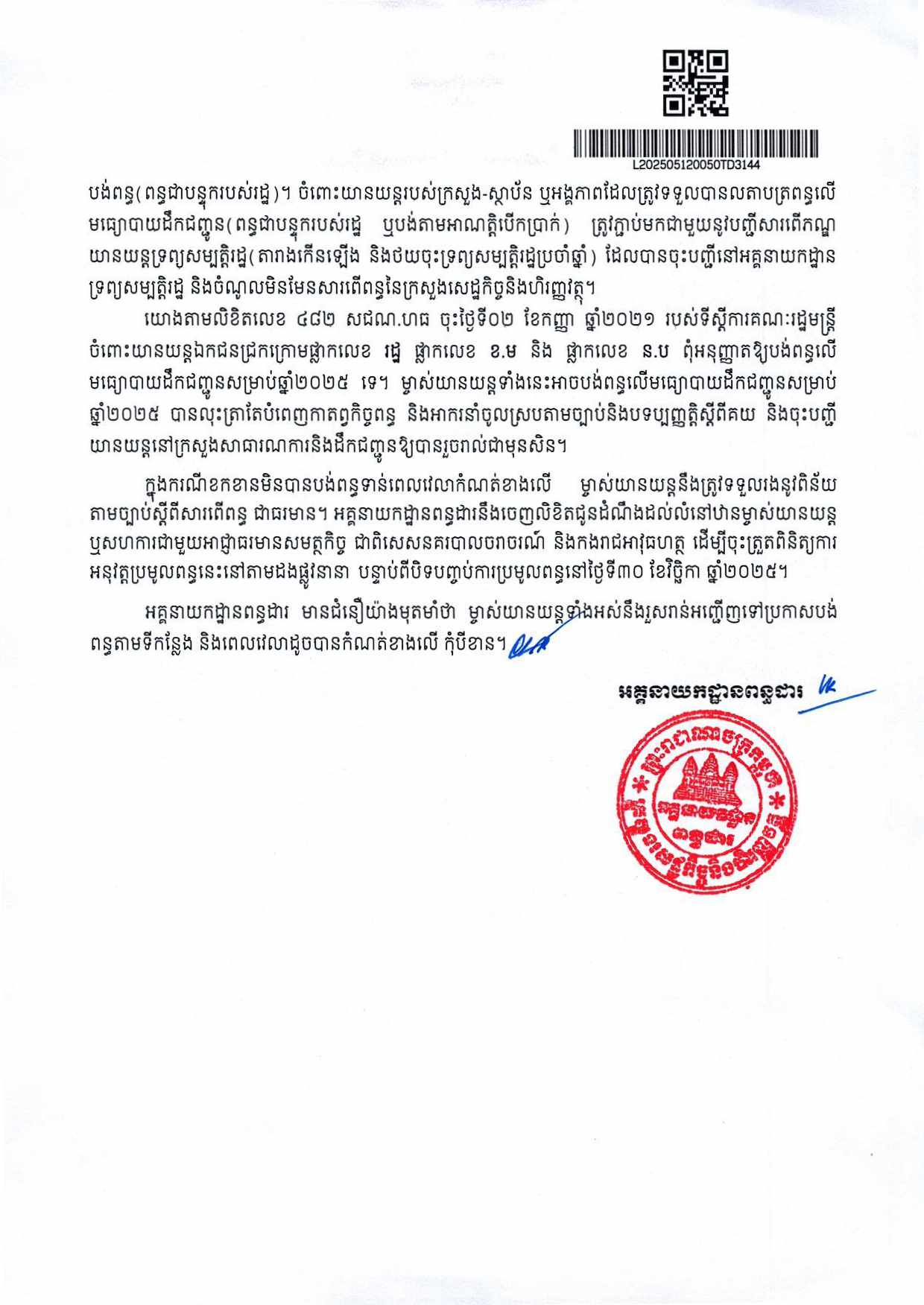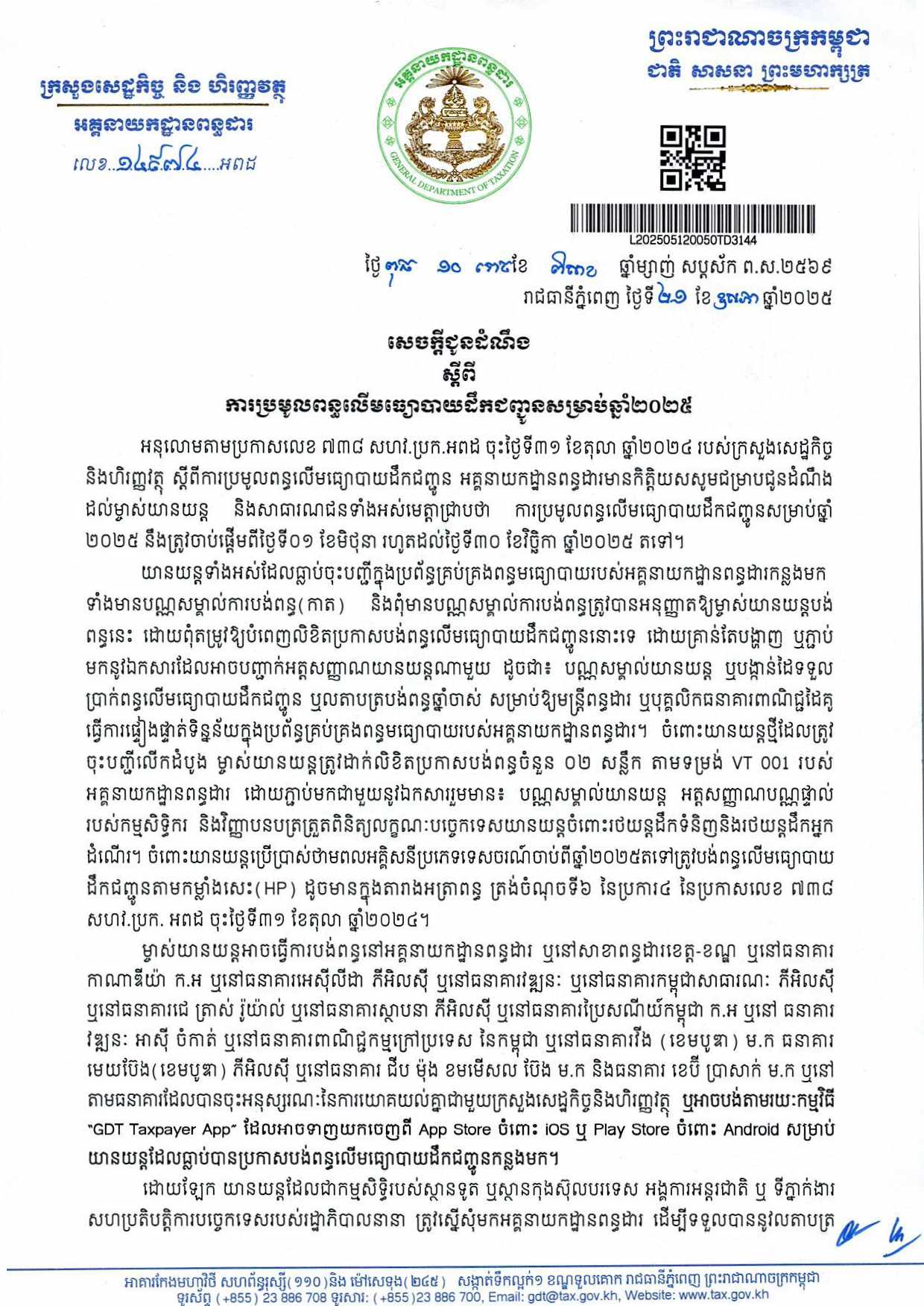 គិតត្រឹមថ្ងៃទី ០៧ ខែតុលា ឆ្នាំ ២០២៥ នេះ គឺសល់ពេលត្រឹមតែជាង ១ ខែទៀតប៉ុណ្ណោះ នឹងឈានដល់ថ្ងៃផុតកំណត់ការប្រមូលពន្ធយានយន្ត ខណៈក្នុងឆ្នាំ ២០២៥ នេះ ការប្រមូលពន្ធលើមធ្យោបាយដឹកជញ្ជូនសម្រាប់ឆ្នាំ ២០២៥ បានចាប់ផ្តើមពីថ្ងៃទី ០១ ខែមិថុនា រហូតដល់ថ្ងៃទី ៣០ ខែវិច្ឆិកា ឆ្នាំ ២០២៥ ខាងមុខនេះ។
