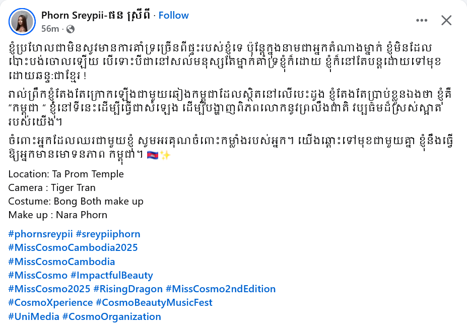 កញ្ញា ផន ស្រីពី បានរៀបរាប់ថា៖ «ខ្ញុំប្រហែលជាមិនសូវមានការគាំទ្រច្រេីនពីផ្ទះរបស់ខ្ញុំទេ ប៉ុន្តែក្នុងនាមជាអ្នកតំណាងម្នាក់ ខ្ញុំមិនដែលបោះបង់ចោលឡេីយ! បើទោះបីជា នៅសល់មនុស្សតែម្នាក់គាំទ្រខ្ញុំក៏ដោយ ខ្ញុំក៏នៅតែបន្តដោយទៅមុខដោយឆន្ទៈជាខ្មែរ! រាល់ព្រឹក ខ្ញុំតែងតែក្រោកឡេីងជាមួយឆៀងកម្ពុជាដែលស្ថិតនៅលេីបេះដូង ខ្ញុំតែងតែប្រាប់ខ្លួនឯងថា ខ្ញុំគឺ «កម្ពុជា» ខ្ញុំនៅទីនេះ ដើម្បីធ្វើជាសំឡេង ដើម្បីបង្ហាញពិភពលោកនូវព្រលឹងជាតិ វប្បធម៌ដ៏ស្រស់ស្អាតរបស់យើង។ ចំពោះអ្នក ដែលឈរជាមួយខ្ញុំ សូមអរគុណចំពោះកម្លាំងរបស់អ្នក។ យើងឆ្ពោះទៅមុខជាមួយគ្នា ខ្ញុំនឹងធ្វើឱ្យអ្នកមានមោទកភាព កម្ពុជា»៕