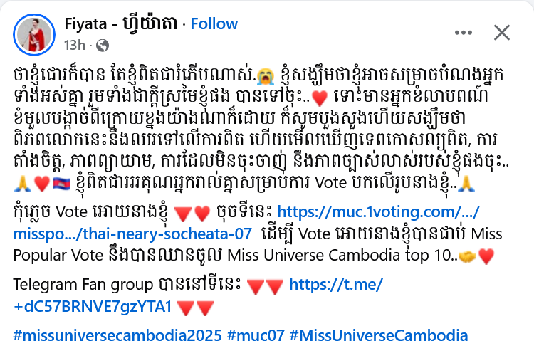 បើគិតមកដល់ពេលនេះ រយៈពេលប្រមាណជាង ២ ខែមកហើយ នៃដំណើរនៃការប្រកួត Miss Universe Cambodia 2025 ក្នុងការបន្តដំណើរស្វែងរកស្ត្រីខ្លាំងក្លាយទៅជាម្ចាស់មកុដ ដើម្បីតំណាងឱ្យកម្ពុជាទៅកាន់ឆាកអន្តរជាតិ។