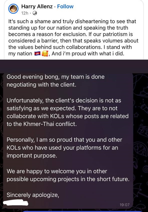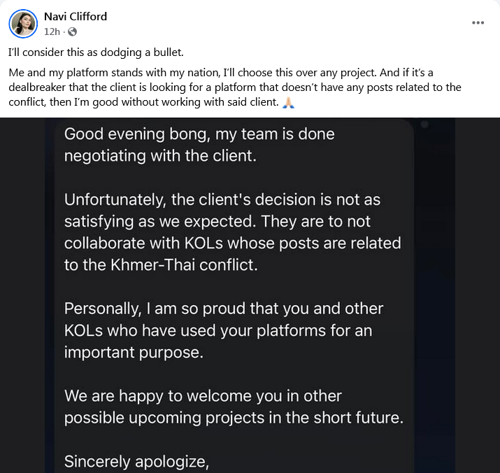 ក្នុងនោះដំបូងឡើយ គេបានឃើញស្រីស្អាតកូនកាត់ខ្មែរ-ស្កុតឡេន កញ្ញា Navi Clifford ជាតារាម៉ូដែល និង ជាអ្នកគ្រប់គ្រងកញ្ញា Melina តារាស្រីកូនកាត់ខ្មែរ-បារាំង បានបង្ហោះរូបភាពនៃសារឆ្លងឆ្លើយ ដោយខាងក្រុមហ៊ុននោះសរសេរថា ៖ «សួស្តីបង ក្រុមការងារខ្ញុំកំពុងចរចាជាមួយអតិថិជនហើយ។ ជាអកុសល ការសម្រេចចិត្តរបស់អតិថិជនមិនពេញចិត្តដូចដែលយើងរំពឹងទុកនោះទេ។ ពួកគេមិនសហការជាមួយ KOL ដែលបានបង្ហោះពាក់ព័ន្ធនឹងជម្លោះខ្មែរ-ថៃនោះទេ។ ការពិត ខ្ញុំមានមោទកភាពណាស់ដែលបង និង KOLs ផ្សេងទៀតបានប្រើវេទិការបស់បងសម្រាប់គោលបំណងដ៏សំខាន់មួយ។ យើងរីករាយក្នុងការស្វាគមន៍អ្នកនៅក្នុងគម្រោង ដែលអាចធ្វើទៅបានផ្សេងទៀតនាពេលអនាគតដ៏ខ្លី។ សូមអភ័យទោសដោយស្មោះ»។
