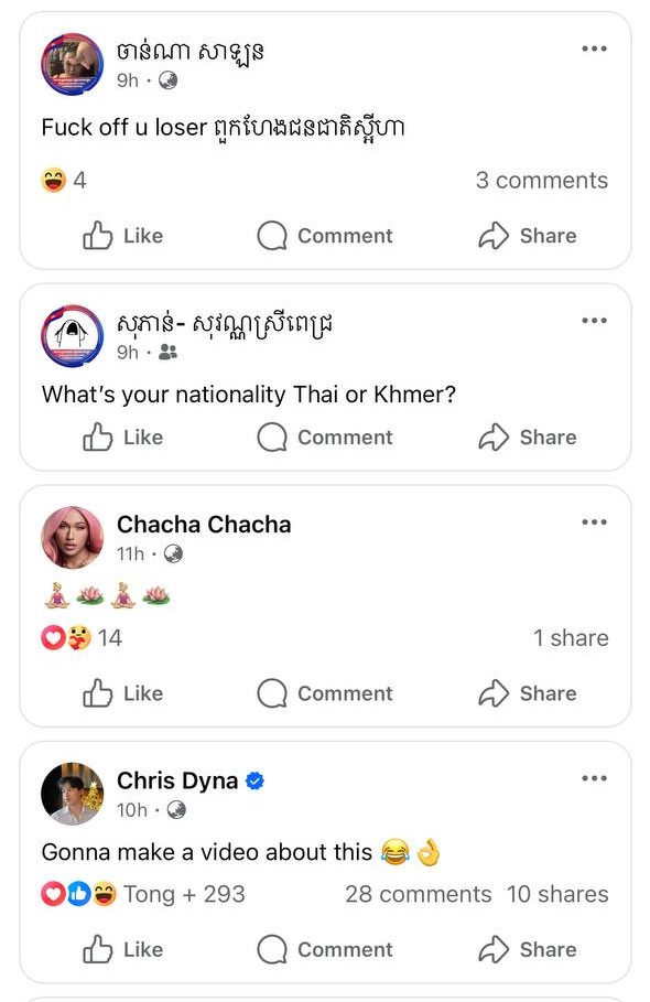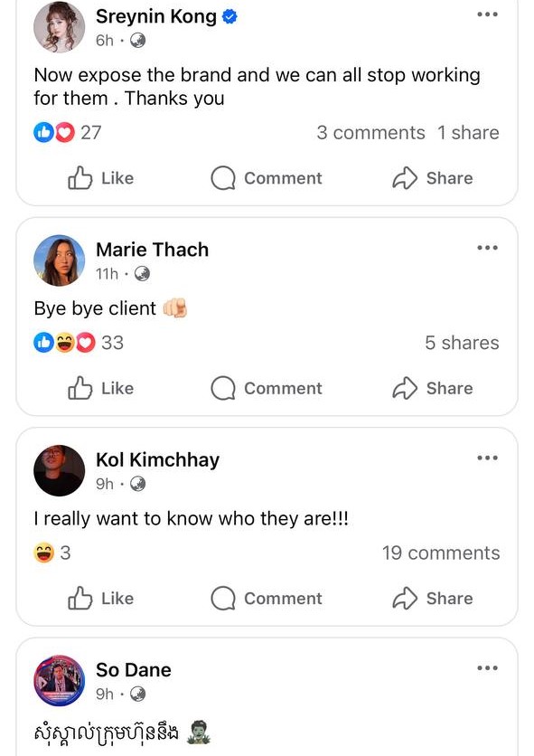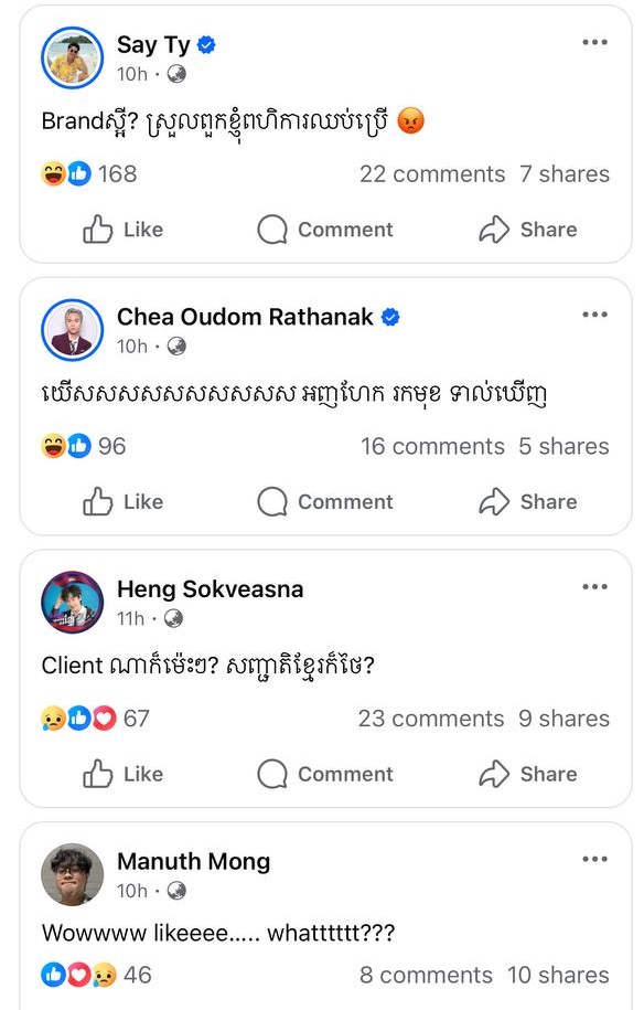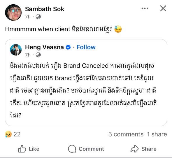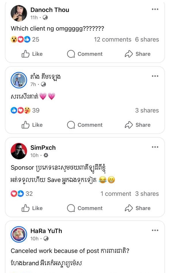 ថ្មីៗនេះ អ្នកលេងបណ្តាញសង្គមហ្វេសប៊ុក ជាពិសេសសិល្បករ សិល្បាការិនី និង អ្នកផលិតមាតិកាមួយចំនួនបានផ្ទុះការប្រតិកម្ម ក្រោយបានដឹងដំណឹងពីក្រុមហ៊ុនមួយបានឆាតមកលុបចោលការងារ ដោយលើកហេតុផលថាតួនិយាយរឿងប្រទេសជាតិ។