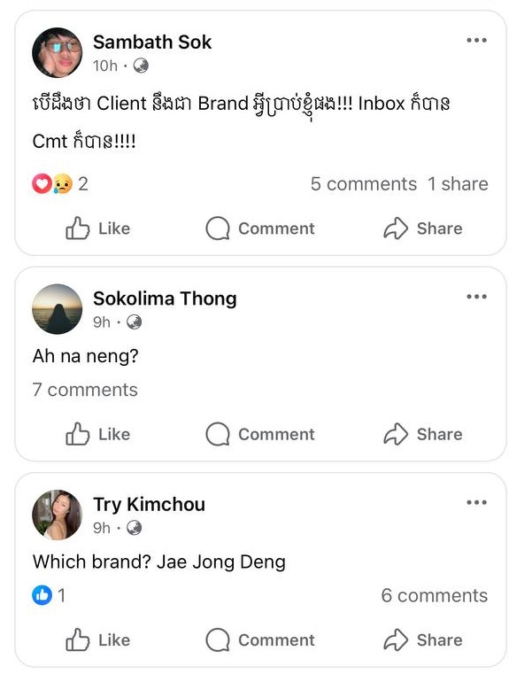 ក្នុងនោះដំបូងឡើយ គេបានឃើញស្រីស្អាតកូនកាត់ខ្មែរ-ស្កុតឡេន កញ្ញា Navi Clifford ជាតារាម៉ូដែល និង ជាអ្នកគ្រប់គ្រងកញ្ញា Melina តារាស្រីកូនកាត់ខ្មែរ-បារាំង បានបង្ហោះរូបភាពនៃសារឆ្លងឆ្លើយ ដោយខាងក្រុមហ៊ុននោះសរសេរថា ៖ «សួស្តីបង ក្រុមការងារខ្ញុំកំពុងចរចាជាមួយអតិថិជនហើយ។ ជាអកុសល ការសម្រេចចិត្តរបស់អតិថិជនមិនពេញចិត្តដូចដែលយើងរំពឹងទុកនោះទេ។ ពួកគេមិនសហការជាមួយ KOL ដែលបានបង្ហោះពាក់ព័ន្ធនឹងជម្លោះខ្មែរ-ថៃនោះទេ។ ការពិត ខ្ញុំមានមោទកភាពណាស់ដែលបង និង KOLs ផ្សេងទៀតបានប្រើវេទិការបស់បងសម្រាប់គោលបំណងដ៏សំខាន់មួយ។ យើងរីករាយក្នុងការស្វាគមន៍អ្នកនៅក្នុងគម្រោង ដែលអាចធ្វើទៅបានផ្សេងទៀតនាពេលអនាគតដ៏ខ្លី។ សូមអភ័យទោសដោយស្មោះ»។