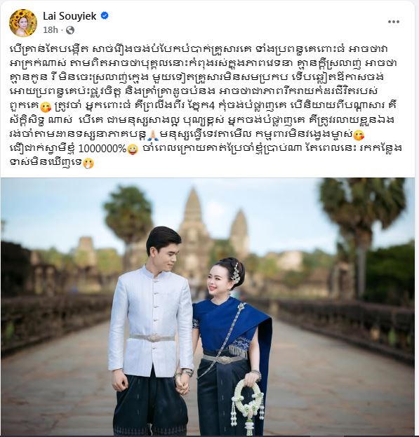 ការបង្ហោះនោះ លោកស្រី ឡាយ ស៊ូយៀក បានរៀបរាប់ថា ៖ «បើគ្រាន់តែបង្កើត សាច់រឿងចង់បំបែកបំបាក់គ្រួសារគេ ទាំងប្រពន្ធគេពោះធំ អាចថាវាអាក្រក់ណាស់ តាមពិតអាចថាបុគ្គលនោះកំពុងរស់ក្នុងភាពវេទនា គ្មានក្តីស្រឡាញ់ អាចថា គ្មានកូន ឬ មិនចេះស្រឡាញ់ក្មេង មួយទៀតគ្រួសារមិនសមប្រកប ទើបឆ្លៀតឱកាសចង់ឱ្យប្រពន្ធគេប៉ះផ្លូវចិត្ត និង គ្រាំគ្រាដូចបំណង អាចថាជាភាពរីករាយកំដរជីវិតរបស់ពួកគេ ត្រូវចាំអ្នកពោះធំ គឺព្រលឹងពីរ ភ្នែក 4 កុំចង់បំផ្លាញគេ បើនិយាយពីបណ្តាសា គឺ ស័ក្តិសិទ្ធ ណាស់ បើគេជាមនុស្សសាងល្អ បុណ្យខ្ពស់ អ្នកចង់បំផ្លាញគេ គឺត្រូវរលាយខ្លួនឯង រង់ចាំតាមដានទស្សនាភាគបន្ត មនុស្សធ្វើទេវតាមើល កម្មពារមិនវង្វេងម្ចាស់ ជឿជាក់ស្វាមីខ្ញុំ 1000000% ចាំពេលក្រោយគាត់ប្រែ ចាំខ្ញុំប្រាប់ណា តែពេលនេះ រកកន្លែងទាស់មិនឃើញទេ»។