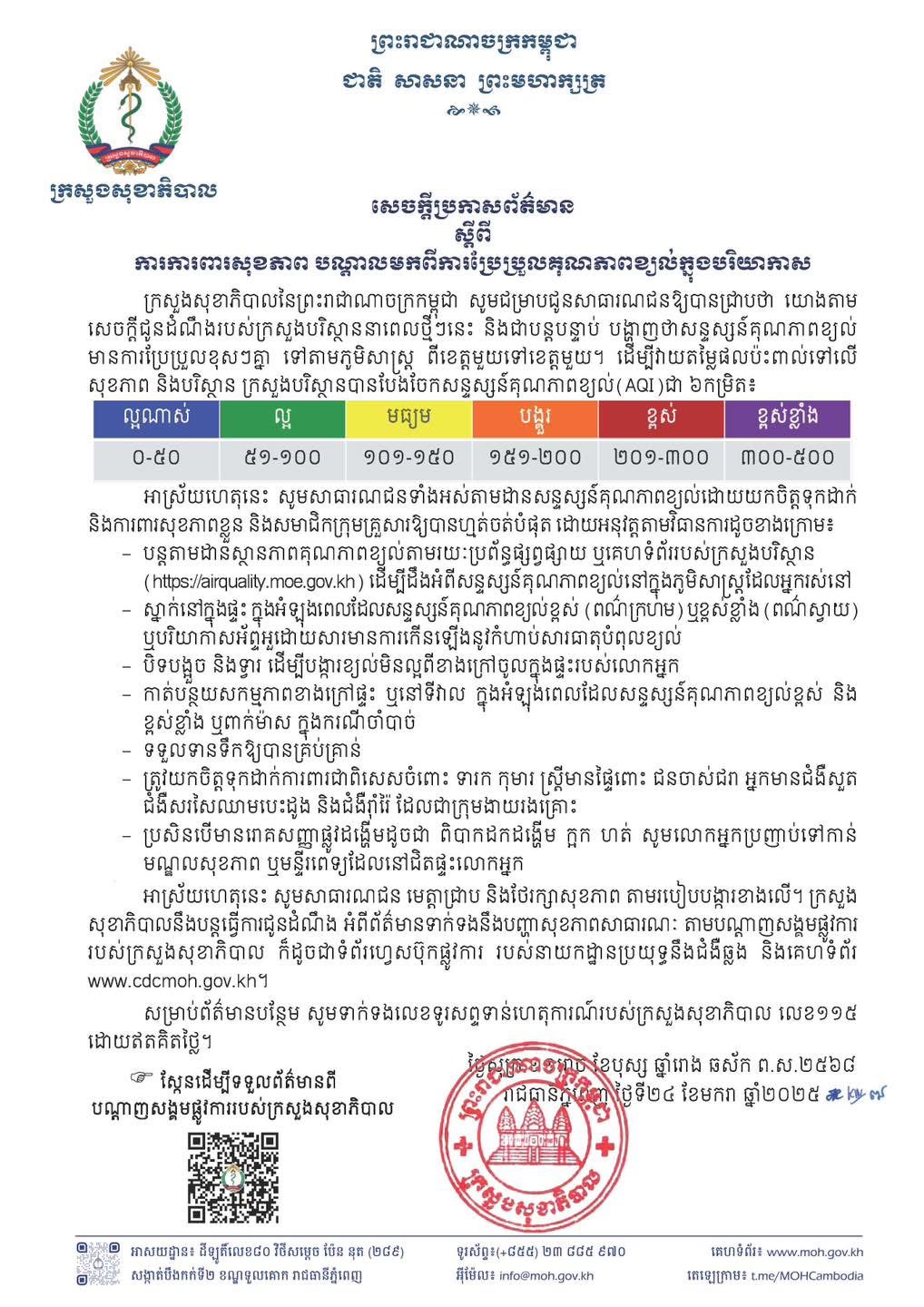 នៅព្រឹកថ្ងៃទី ២៥ ខែមករា ឆ្នាំ ២០២៥ នេះ ក្រសួងសុខាភិបាល បានចេញសេចក្ដីជូនដំណឹង ស្តីពីការការពារសុខភាព បណ្តាលមកពីការប្រែប្រួលគុណភាពខ្យល់ក្នុងបរិយាកាស ដែលយោងតាមក្រសួងបរិស្ថាន នាពេលថ្មីៗនេះ និង ជាបន្តបន្ទាប់ បង្ហាញថាសន្ទស្សន៍គុណភាពខ្យល់ មានការប្រែប្រួលខុសៗគ្នា ទៅតាមភូមិសាស្ត្រ ពីខេត្តមួយទៅខេត្តមួយ។