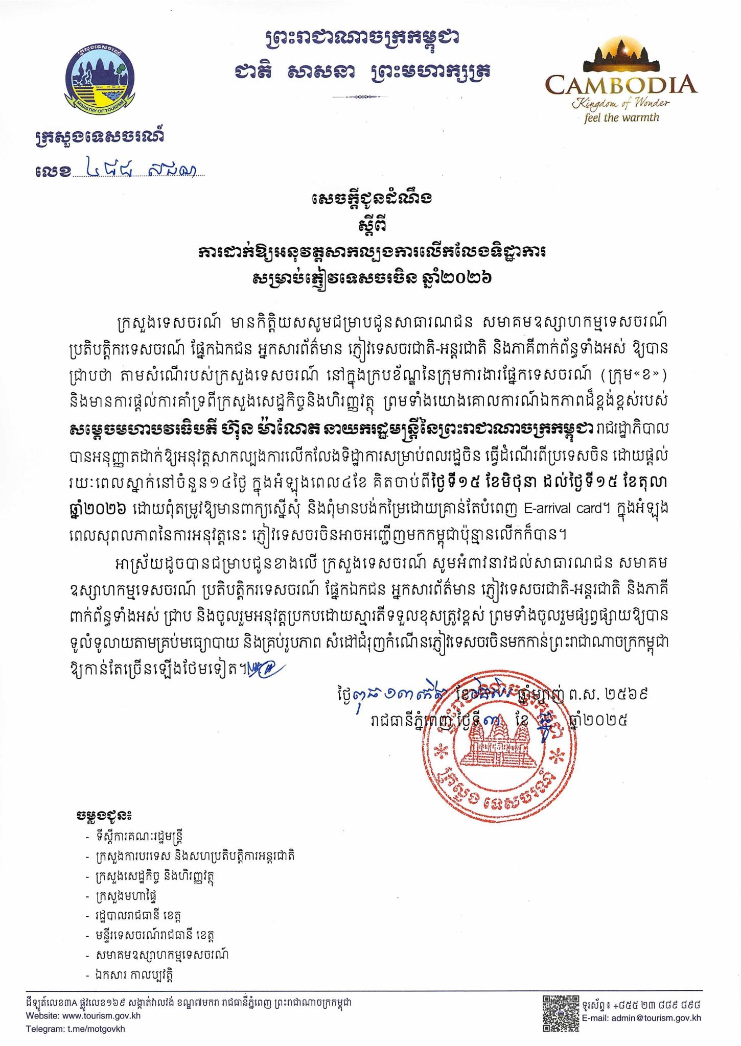 តាមរយៈសេចក្ដីជូនដំណឹង ក្រសួងបានបញ្ជាក់ឱ្យបានដឹងថា តាមសំណើរបស់ក្រសួងទេសចរណ៍ នៅក្នុងក្របខ័ណ្ឌនៃក្រុមការងារផ្នែកទេសចរណ៍ (ក្រុម«ខ») និង មានការផ្តល់ការគាំទ្រពីក្រសួងសេដ្ឋកិច្ច និង ហិរញ្ញវត្ថុ ព្រមទាំងយោងគោលការណ៍ឯកភាពដ៏ខ្ពង់ខ្ពស់របស់សម្តេចមហាបវរធិបតី ហ៊ុន ម៉ាណែត នាយករដ្ឋមន្ត្រីនៃព្រះរាជាណាចក្រកម្ពុជា រាជរដ្ឋាភិបាល បានអនុញ្ញាតដាក់ឱ្យអនុវត្តសាកល្បងការលើកលែងទិដ្ឋាការសម្រាប់ពលរដ្ឋចិន ធ្វើដំណើរពីប្រទេសចិន ដោយផ្តល់រយៈពេលស្នាក់នៅចំនួន ១៤ ថ្ងៃ ក្នុងអំឡុងពេល ៤ ខែ គិតចាប់ពីថ្ងៃទី ១៥ ខែមិថុនា ដល់ថ្ងៃទី ១៥ ខែតុលា ឆ្នាំ ២០២៦ ដោយពុំតម្រូវឱ្យមានពាក្យស្នើសុំ និង ពុំមានបង់កម្រៃដោយគ្រាន់តែបំពេញ E-arrival card។