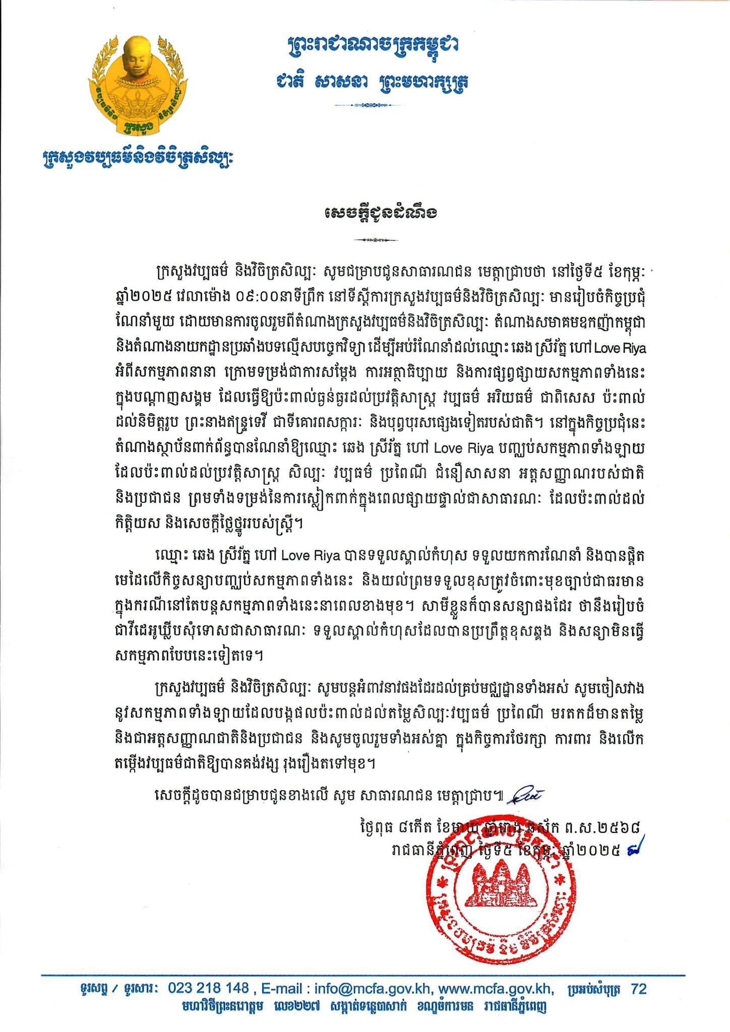 នៅព្រឹកថ្ងៃទី ០៥ ខែកុម្ភៈ ឆ្នាំ ២០២៥ នេះ វេលាម៉ោង ០៩:០០ នៅទីស្តីការក្រសួងវប្បធម៌ និងវិចិត្រសិល្បៈ មានរៀបចំកិច្ចប្រជុំ ណែនាំមួយ ដោយមានការចូលរួមពីតំណាងក្រសួងវប្បធម៌ និងវិចិត្រសិល្បៈ តំណាងសមាគមឧកញ៉ាកម្ពុជា និង តំណាងនាយកដ្ឋានប្រឆាំងបទល្មើសបច្ចេកវិទ្យា ដើម្បីអប់រំណែនាំដល់ឈ្មោះ ឆេង ស្រីរ័ត្ន ហៅ Love Riya អំពីសកម្មភាពនានា ក្រោមទម្រង់ជាការសម្តែង ការអត្ថាធិប្បាយ និង ការផ្សព្វផ្សាយសកម្មភាពទាំងនេះ ក្នុងបណ្តាញសង្គម ដែលធ្វើឱ្យប៉ះពាល់ធ្ងន់ធ្ងរដល់ប្រវត្តិសាស្ត្រ វប្បធម៌ អរិយធម៌ ជាពិសេស ប៉ះពាល់ដល់និមិត្តរូប ព្រះនាងឥន្ទ្រទេវី ជាទីគោរពសក្ការៈ និង បុព្វបុរសផ្សេងទៀតរបស់ជាតិ។