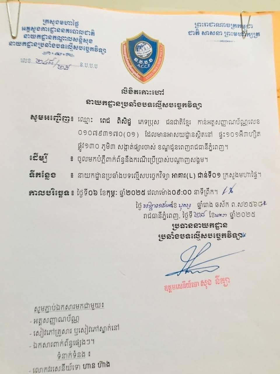សូមរំឭកផងដែរថា តាមរយៈលិខិតរបស់នាយកដ្ឋានប្រឆាំងបទល្មើសបច្ចេកវិទ្យា ចុះនៅថ្ងៃទី ២៨ ខែមករា ឆ្នាំ ២០២៥ បានកោះហៅបុគ្គលឈ្មោះ ពេជ ពិសិដ្ឋ ដែលតាំងខ្លួនឯងថាជាអធិរាជសំឡេងមាស ស៊ីន ស៊ីសាមុត ចាប់ជាតិ ឱ្យចូលខ្លួនបំភ្លឺពាក់ព័ន្ធនឹងករណីប្រើប្រាស់បណ្ដាញសង្គម នៅនាយកដ្ឋានប្រឆាំងបទល្មើសបច្ចេកវិទ្យា អគារ (L) ជាន់ទី ១ ក្រសួងមហាផ្ទៃ ខណៈកាលបរិច្ឆេទគឺនៅថ្ងៃទី ០៦ ខែកុម្ភៈ ឆ្នាំ ២០២៥ វេលាម៉ោង ០៩៖០០ នាទីព្រឹក៕