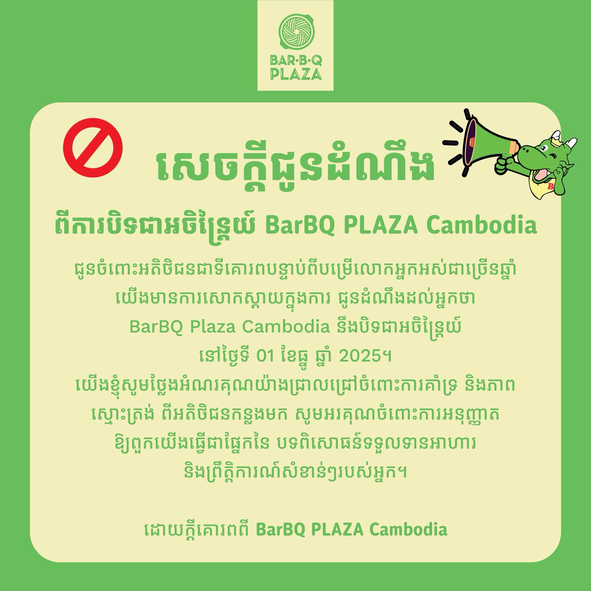 ជាដំណឹងមួយគួរឱ្យភ្ញាក់ផ្អើល ដោយនៅថ្ងៃទី ០១ ខែធ្នូ ឆ្នាំ ២០២៥ គណនីហ្វេសប៊ុកផេកផ្លូវការ BarBQ PLAZA Cambodia បានចេញសេចក្តីជូនដំណឹងមួយ ពីការបិទទ្វាជាអចិន្ត្រៃយ៍ ចាប់ពីថ្ងៃទី ០១ ខែធ្នូ ឆ្នាំ ២០២៥ នេះតទៅ ជាមួយការថ្លែងអំណរគុណយ៉ាងជ្រាលជ្រៅចំពោះការគាំទ្រ និង ភាពស្មោះត្រង់ ពីអតិថិជនរបស់ខ្លួនកន្លងមក។