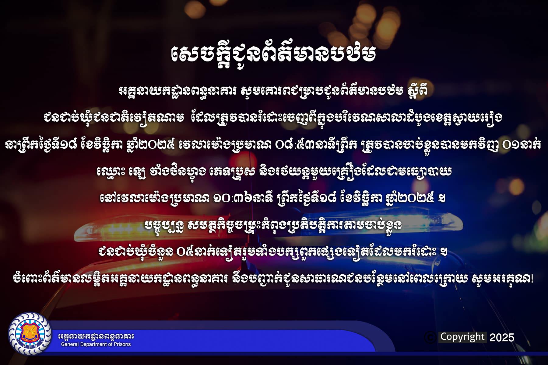ក្នុងនោះ អគ្គនាយកដ្ឋានពន្ធធនាគារ បានជូនព័ត៌មានបឋមឱ្យដឹងថា ជនជាប់ឃុំជនជាតិវៀតណាម ដែលត្រូវបានរំដោះចេញពីក្នុងបរិវេណសាលាដំបូងខេត្តស្វាយរៀង នាព្រឹកថ្ងៃទី ១៨ ខែវិច្ឆិកា ឆ្នាំ ២០២៥ វេលាម៉ោងប្រមាណ ០៨:៥៣ នាទីព្រឹក ត្រូវបានចាប់ខ្លួនបានមកវិញ ០១ នាក់ ឈ្មោះ ឡេ វាំងថិនហ្លួង ភេទប្រុស និង រថយន្តមួយគ្រឿងដែលជាមធ្យោបាយ នៅវេលាម៉ោងប្រមាណ ១០:៣៦ នាទី ព្រឹកថ្ងៃទី ១៨ ខែវិច្ឆិកា ឆ្នាំ២០២៥ ។