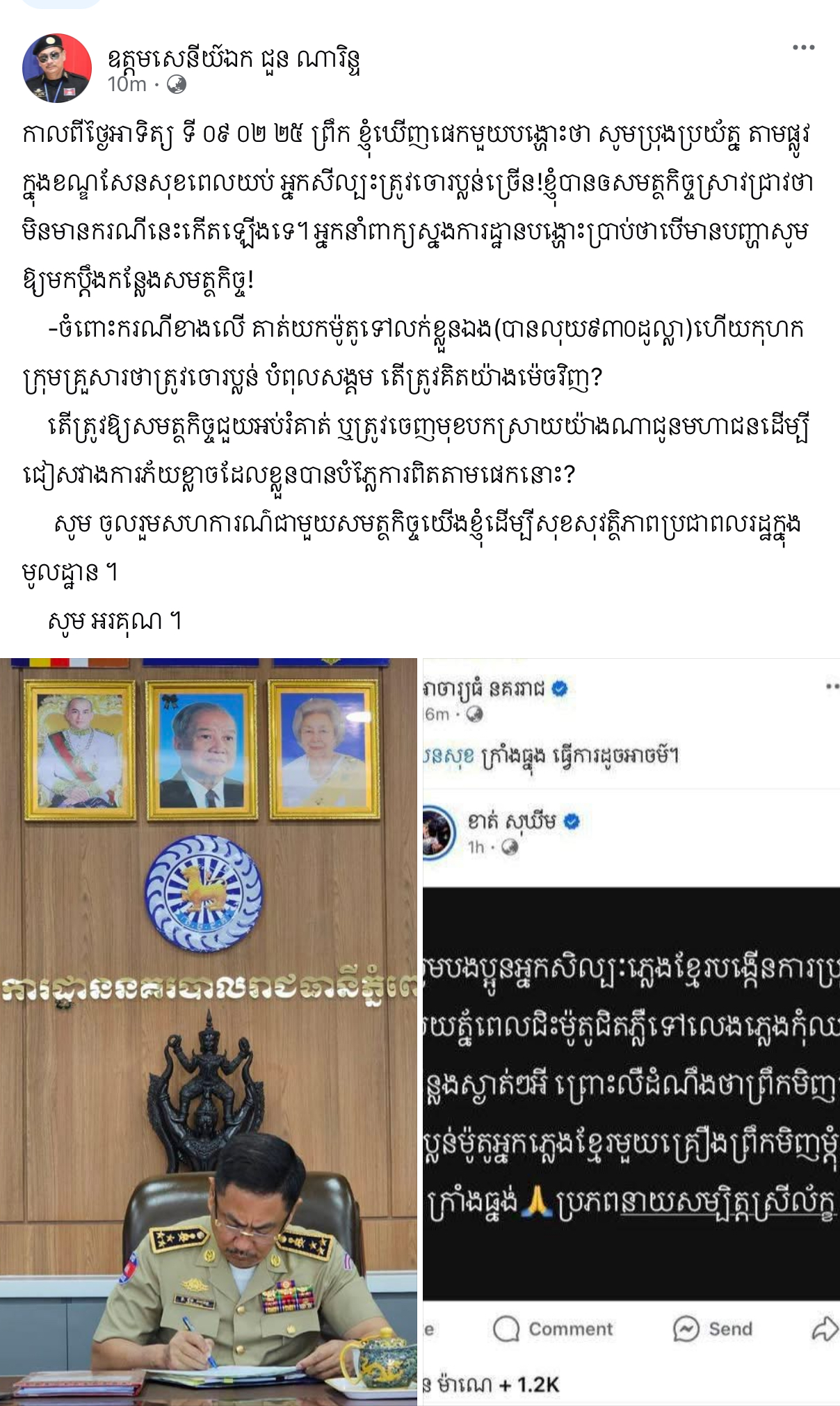 នៅរសៀលថ្ងៃទី ១០ ខែកុម្ភៈ ឆ្នាំ ២០២៥ នេះ ឧត្តមសេនីយ៍ឯក ជួន ណារិន្ទ បានបង្ហោះសារបំភ្លឺពាក់ព័ន្ធនឹងការបង្ហោះកាលពីថ្ងៃទី ០៩ ខែកុម្ភៈ ឆ្នាំ ២០២៥ កន្លងទៅ ដែលមានផេកមួយបង្ហោះថា «សូមប្រុងប្រយ័ត្ន តាមផ្លូវក្នុងខណ្ឌសែនសុខពេលយប់ អ្នកសិល្បៈត្រូវចោរប្លន់ច្រើន»