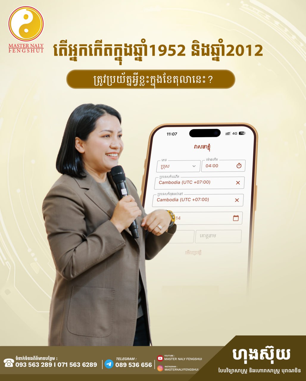 នៅព្រឹកថ្ងៃទី ១០ ខែតុលា ឆ្នាំ ២០២៥ នេះ តាមរយៈផេក Master Naly Fengshui របស់អ្នកគ្រូ ណាលី ដែលជាគ្រូហុងស៊ុយបែបវិទ្យាសាស្ត្រដ៏មានប្រជាប្រិយភាព បានចែករំលែកពីរឿងរ៉ាវដែលត្រូវប្រុងប្រយ័ត្នចំពោះឆ្នាំចំនួន ២ នៅ ក្នុងខែតុលានេះ។