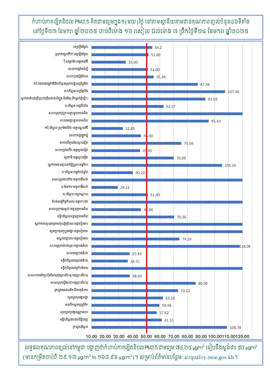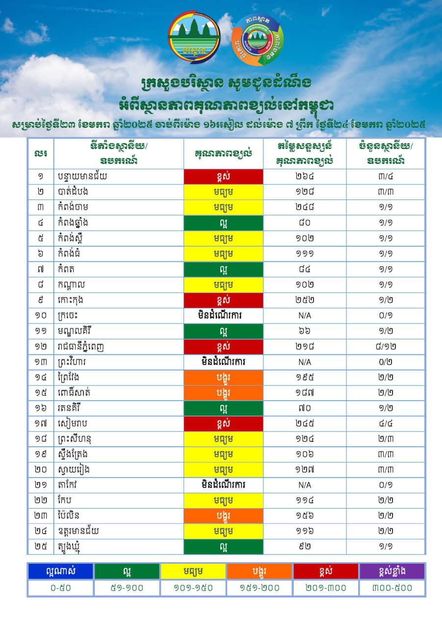 នៅព្រឹកថ្ងៃទី ២៤ ខែមករា ឆ្នាំ ២០២៤ នេះ ក្រសួងបរិស្ថាន បានជូនដំណឹងពីស្ថានភាពគុណភាពខ្យល់នៅកម្ពុជា សម្រាប់ថ្ងៃទី ២៣ ខែមករា ឆ្នាំ ២០២៥ ចាប់ពីម៉ោង ១៦ រសៀល ដល់ម៉ោង ៧ ព្រឹក ថ្ងៃទី ២៤ ខែមករា ឆ្នាំ ២០២៥។