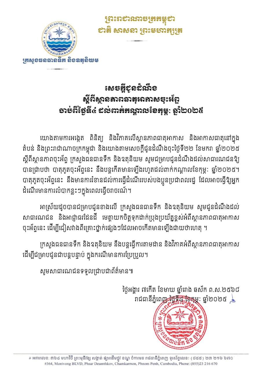 នៅថ្ងៃទី ០៤ ខែកុម្ភៈ ឆ្នាំ ២០២៥ ក្រសួងធនធានទឹក និង ឧតុនិយម បានចេញសេចក្ដីជូនដំណឹងឱ្យបានដឹងថា យោងតាមការអង្កេត ពិនិត្យ និង វិភាគលើស្ថានភាពធាតុអាកាស នៅក្នុងតំបន់  និង យោងតាមសេចក្តីជូនដំណឹងចុះថ្ងៃទី ២២ ខែមករា ឆ្នាំ ២០២៥ ស្តីពីស្ថានភាពចុះអ័ព្ទ ក្រសួងបានបញ្ជាក់ឱ្យបានដឹងថា បាតុភូតចុះអ័ព្ទនេះ នឹងបន្តកើតមានឡើងរហូតដល់ពាក់កណ្តាលខែកុម្ភៈ ឆ្នាំ ២០២៥។