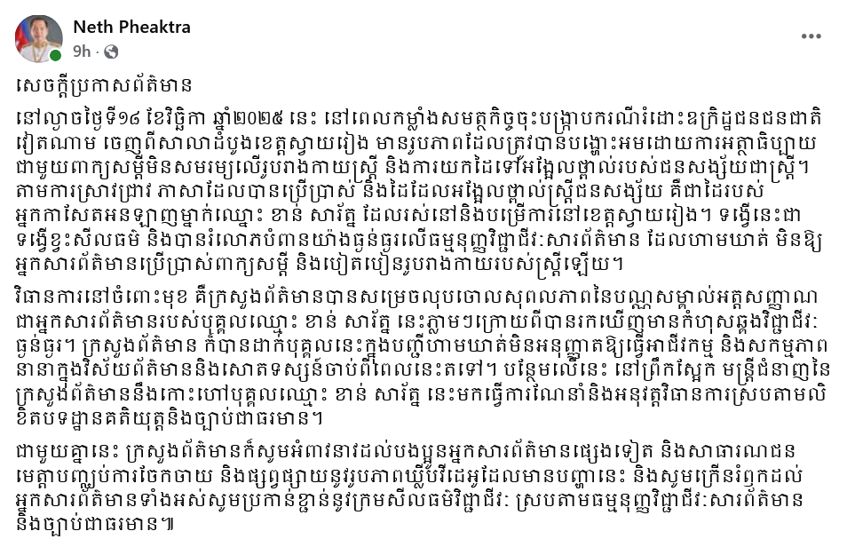ករណីអសីលធម៌ខាងលើនោះដែរ ឯកឧត្តម នេត្រ ភក្ត្រា រដ្ឋមន្ត្រីក្រសួងព័ត៌មាន បានចេញសេចក្តីប្រកាសព័ត៌មាន ក្នុងវិធានការនៅចំពោះមុខ ដោយបានសម្រេចលុបចោលសុពលភាពនៃប័ណ្ណសម្គាល់អត្តសញ្ញាណជាអ្នកសារព័ត៌មានរូបនោះ និង ដាក់បុគ្គលនេះក្នុងបញ្ជីហាមឃាត់មិនអនុញ្ញាតឱ្យធ្វើអាជីវកម្ម និង សកម្មភាពនានាក្នុងវិស័យព័ត៌មាន និង សោតទស្សន៍ចាប់ពីពេលនេះតទៅ។ បន្ថែមលើនេះ មន្ត្រីជំនាញនៃក្រសួងព័ត៌មាននឹងកោះហៅបុគ្គល នេះមកធ្វើការណែនាំ និង អនុវត្តវិធានការស្របតាមលិខិតបទដ្ឋានគតិយុត្តនិងច្បាប់ជាធរមាន។