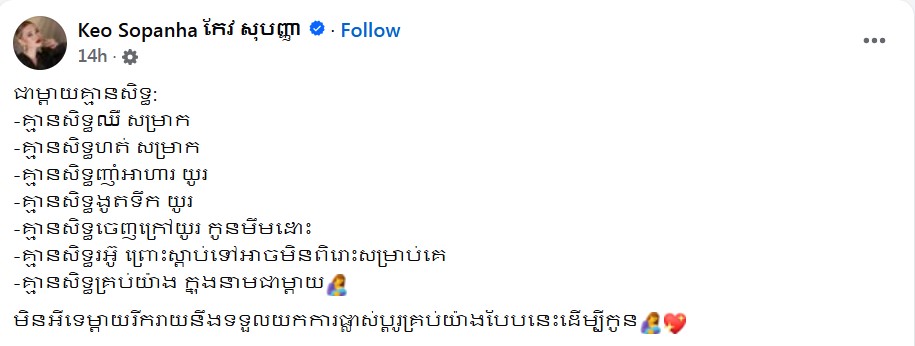 អ្នកនាង កែវ សុបញ្ញា បានរៀបរាប់ថា៖ «ជាម្តាយគ្មានសិទ្ធិ៖ -គ្មានសិទ្ធិឈឺ សម្រាក -គ្មានសិទ្ធិហត់ សម្រាក -គ្មានសិទ្ធិញ៉ាំអាហារយូរ -គ្មានសិទ្ធិងូតទឹកយូរ -គ្មានសិទ្ធិចេញក្រៅយូរ កូនមឹមដោះ -គ្មានសិទ្ធិរអ៊ូ ព្រោះស្តាប់ទៅអាចមិនពីរោះសម្រាប់គេ -គ្មានសិទ្ធិគ្រប់យ៉ាង ក្នុងនាមជាម្តាយ។ មិនអីទេម្តាយរីករាយនឹងទទួលយកការផ្លាស់ប្តូរគ្រប់យ៉ាងបែបនេះ ដើម្បីកូន»៕