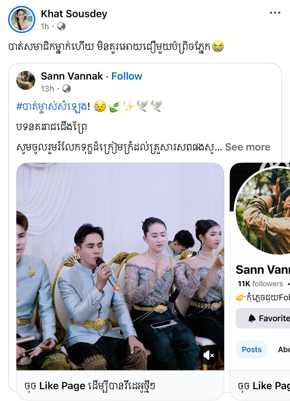 កាលពីថ្ងៃទី ១៧ ខែតុលា ឆ្នាំ ២០២៥ កន្លងទៅនេះ មហាជន ជាពិសេស មិត្តក្នុងសិល្បៈជាច្រើនបានបង្ហាញការសោកស្តាយយ៉ាងខ្លាំង នៃការបាត់បង់ធនធានមនុស្សដ៏ល្អក្នុងវិស័យសិល្បៈបុរាណខ្មែរ គឺលោក ឈឺន ឃីម ហៅលោក ណាឃីម ដែលបានទទួលមរណភាពដោយសាររោគាពាធ។
