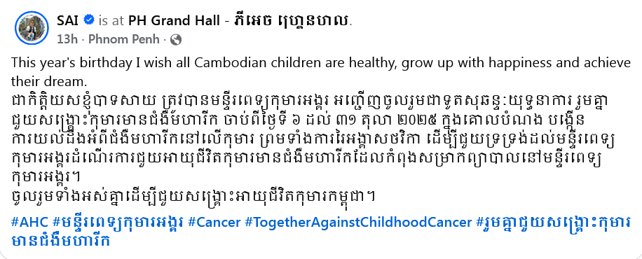 ជាក់ស្តែង កាលពីថ្ងៃទី ០៦ ខែតុលា ឆ្នាំ ២០២៥ ដែលជាថ្ងៃកំណើតគម្រប់ខួប ៣៥ ឆ្នាំ លោក សាយ បានចាប់ផ្តើមបេសកកម្មថ្មីរបស់ខ្លួនទៀតហើយ ជាមួយនឹងមន្ទីរពេទ្យកុមារអង្គរ ក្នុងយុទ្ធនាការ «រួមគ្នាជួយសង្គ្រោះកុមារមានជំងឺមហារីក» ចាប់ពីថ្ងៃទី ០៦ ដល់ ថ្ងៃទី ៣១ ខែតុលា ឆ្នាំ ២០២៥ ខាងមុខនេះ។