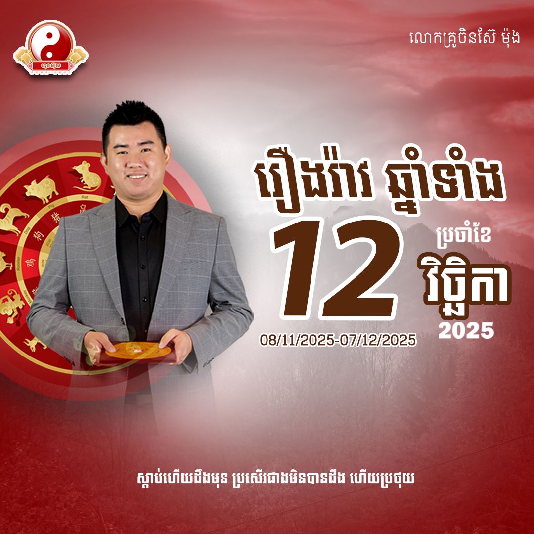 នៅថ្ងៃទី ១១ ខែវិច្ឆិកា ឆ្នាំ ២០២៥ នេះ តាមរយៈផេក ហុងស៊ុយ របស់លោកគ្រូចិនសែ ម៉ុង បានចែករំលែករឿងរ៉ាវរាសីជុំវិញឆ្នាំទាំង ១២ ដែលបានកើតឡើង និង របៀបកែកុនក្នុងខែវិច្ឆិកា ដោយតាមក្បួនហុងស៊ុយគិតចាប់ពីថ្ងៃទី ០៨ ខែវិច្ឆិកា ដល់ថ្ងៃទី ០៧ ខែធ្នូ ឆ្នាំ ២០២៥ ដែលក្នុងខែនេះ ឆ្នាំទាំង ១២ នឹងជួបប្រទះរឿងល្អខ្លះ និង មិនសូវល្អខ្លះ។