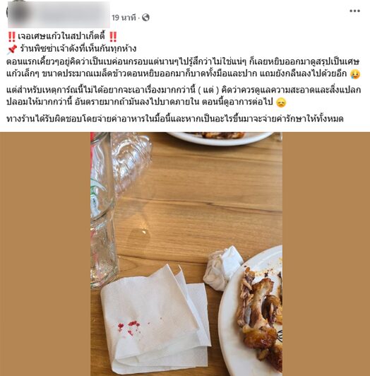 ថ្មីៗនេះ មានបុរសជនជាតិថៃម្នាក់ បានចែករំលែករឿងរ៉ាវដ៏មិននឹកស្មានរបស់ខ្លួន ដែលបានទំពាប៉ះអំបែងកែវនៅក្នុងស្ប៉ាហ្គីទីរបស់ហាងអាហារល្បី ដែលបណ្តាលឱ្យមុតទាំងមាត់ និង មុតទាំងដៃហូរឈាមរហាច។