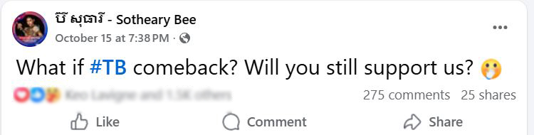 ក្នុងនោះ លើហ្វេសប៊ុកផេករបស់កញ្ញា ប៊ី សុធារី បានបង្ហោះសារស្ទង់មតិរបស់មហាជន ដោយចង់ដឹងថាគាំទ្រឱ្យនាងវិលចូលប្រកួតដណ្ដើមមកុដម្ដងទៀត ឬយ៉ាងណានោះថា ៖ «What if #TB comeback? Will you still support us?»៕