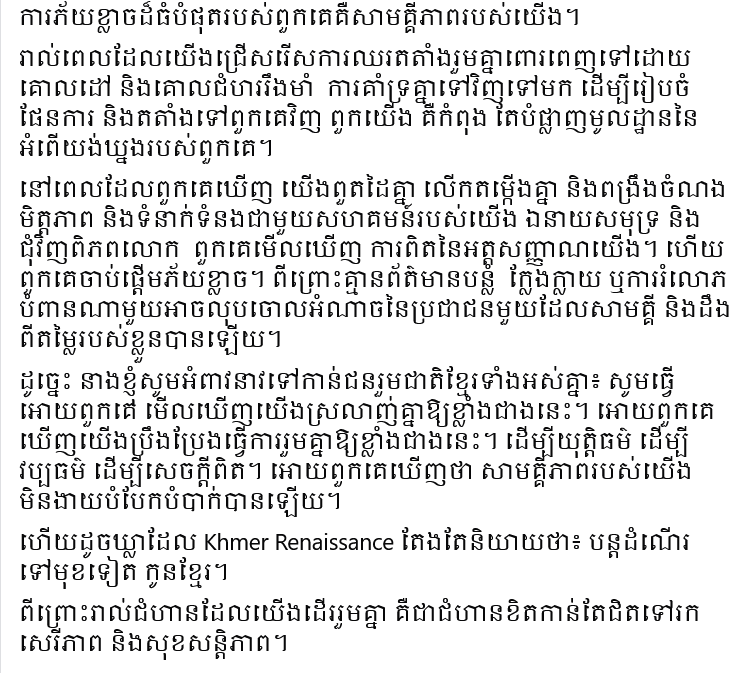 ដូចពាក្យស្លោកថា «ចង្កឹះមួយដើមគេកាច់បាក់តែបើចង្កឹះមួយបាច់គេកាច់មិនបាក់ទេ» ពិតជាមិនខុសនោះឡើយ។ ជាក់ស្តែង ស្ថានភាពប្រទេសកម្ពុជានាពេលនេះ បានសបញ្ជាក់ពីការសាមគ្គីភាពគ្នាគ្រប់ទីកន្លែងរបស់ប្រជាជនកម្ពុជា មិនថាក្នុង និង ក្រៅប្រទេសនោះទេ ដែលជាការសម្រេចនៃភាពជោគជ័យ។