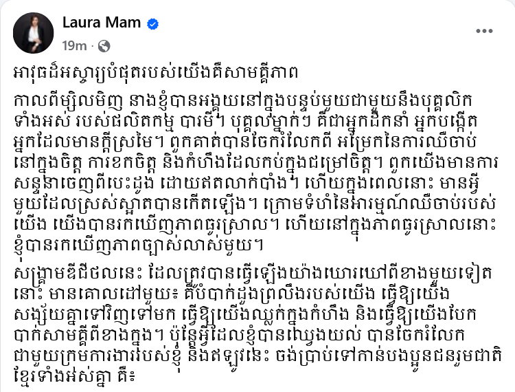 យ៉ាងណាមិញ ក្រោយឃើញការសាមគ្គីភាពគ្នារបស់ប្រជាជនកម្ពុជាគ្រប់ទីកន្លែង គ្រប់បណ្តាប្រទេសនោះ កញ្ញា ឡរ៉ា ម៉ម បានចេញមកបង្ហោះសំណេរបង្ហាញពីផ្នត់គំនិតរបស់ខ្លួន និង អំពាវនាវឱ្យខ្មែរធ្វើឱ្យប្រទេសដទៃ មើលឃើញយើងស្រលាញ់គ្នាឱ្យខ្លាំងជាងនេះ ឱ្យប្រទេសដទៃឃើញ ខ្មែរប្រឹងប្រែងធ្វើការរួមគ្នាឱ្យខ្លាំងជាងនេះ ដើម្បីយុត្តិធម៌ ដើម្បីវប្បធម៌ ដើម្បីសេចក្ដីពិត ឱ្យពួកគេឃើញថា សាមគ្គីភាពរបស់ ខ្មែរមិនងាយបំបែកបំបាក់បានឡើយ៕