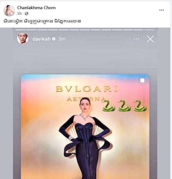 ក្រោយឃើញការបង្ហោះរបស់តារាថៃ Mai Davikah ហាក់មើលងាយលើកម្ពុជាបែបនេះ ក៏បានឃើញជំទាវ ចន ច័ន្ទលក្ខិណា បានចែករំលែកពីរូបភាពរបស់តារាថៃរូបនេះ ភ្ជាប់ជាមួយមតិយ៉ាងក្ដៅចិត្តទៅកាន់នាងថា ៖ «មីដោះស្វិត មីធ្មេញម៉ាគ្រោង មីភ្នែកអេលាន»៕