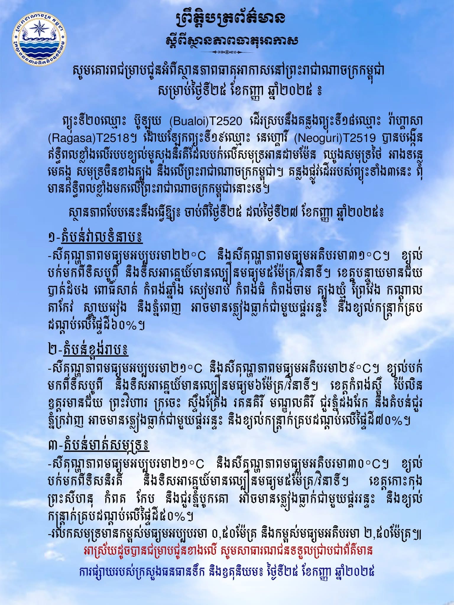នៅព្រឹកថ្ងៃទី ២៥ ខែកញ្ញា ឆ្នាំ ២០២៥ នេះ ក្រសួងធនធានទឹក និង ឧតុនិយម បានចេញសេចក្ដីជូនដំណឹងស្តីពីស្ថានភាពធាតុអាកាស ឱ្យបានដឹងថា ព្យុះទី ២០ ឈ្មោះ ប៊ូឡូយ (Bualoi) T2520 ដើរស្របនឹងគន្លងព្យុះទី ១៨ ឈ្មោះ រ៉ាហ្គាសា (Ragasa)T2518។ ដោយឡែក ព្យុះទី ១៩ ឈ្មោះ នេហ្គោរី (Neoguri) T2519 បានបង្កើនឥទ្ធិពលខ្លាំងលើរបបខ្យល់មូសុងនិរតី ដែលបក់លើសមុទ្រអានដាមម៉ែន ឈូងសមុទ្រថៃ អាងទន្លេ មេគង្គ សមុទ្រចិនខាងត្បូង និង លើកម្ពុជា ខណៈគន្លងផ្លូវដើររបស់ព្យុះទាំង ៣ នេះ ពុំមានឥទ្ធិពលខ្លាំងមកលើកម្ពុជានោះទេ។
