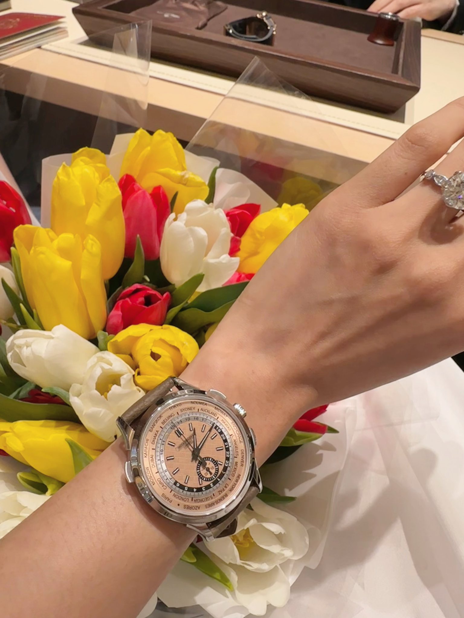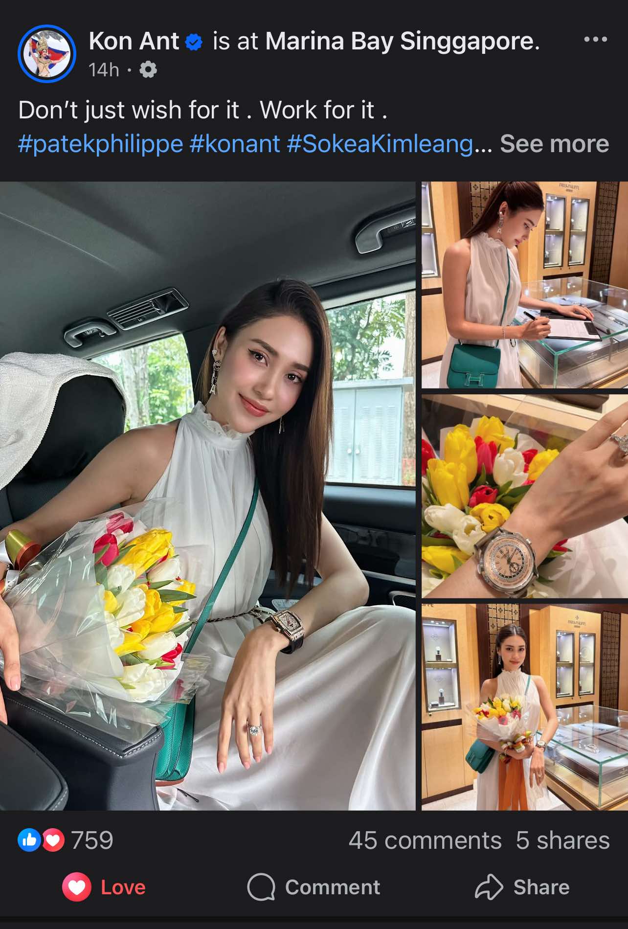 ជាក់ស្តែង ដូចថ្មីថ្មោងនេះ Kon Ant បានបង្ហោះរូបភាពប៉ុន្មានសន្លឹក ថតនៅក្នុងហាងនាឡិកាស្វីសដ៏ល្បីម៉ាក Patek Philippe ហើយ Check in នៅប្រទេសសិង្ហបុរី។ បើតាមរូបភាព នាឡិកានេះជាម៉ូឌែល Patek Philippe World Time Flyback Chronograph (5935A-001)។