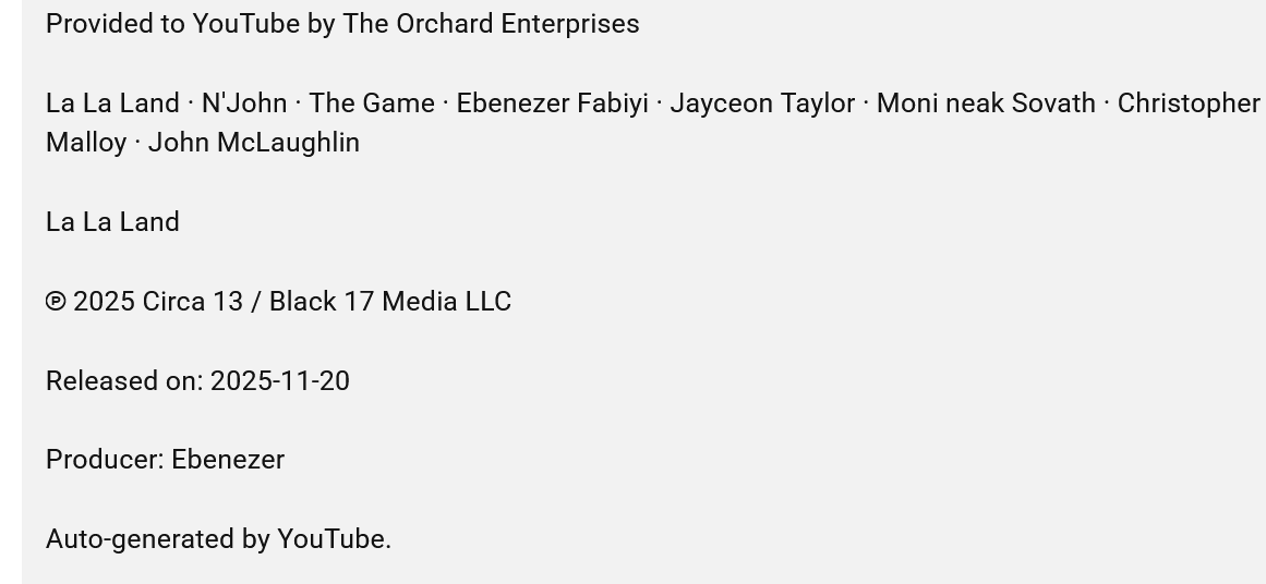 ដោយឡែក ក្នុងចំណោមចម្រៀងទាំង ៦ បទ «La La Land» កំពុងទទួលបានការចាប់អារម្មណ៍ខ្លាំង ខណៈបទចម្រៀងមួយបទនោះ លោក N.John បានបកស្រាយរួមគ្នានឹង តារាចម្រៀងរ៉េប Legend របស់អាមេរិក ដែលល្បីតាំងពីឆ្នាំ ២០០០ មក គឺ The Game។