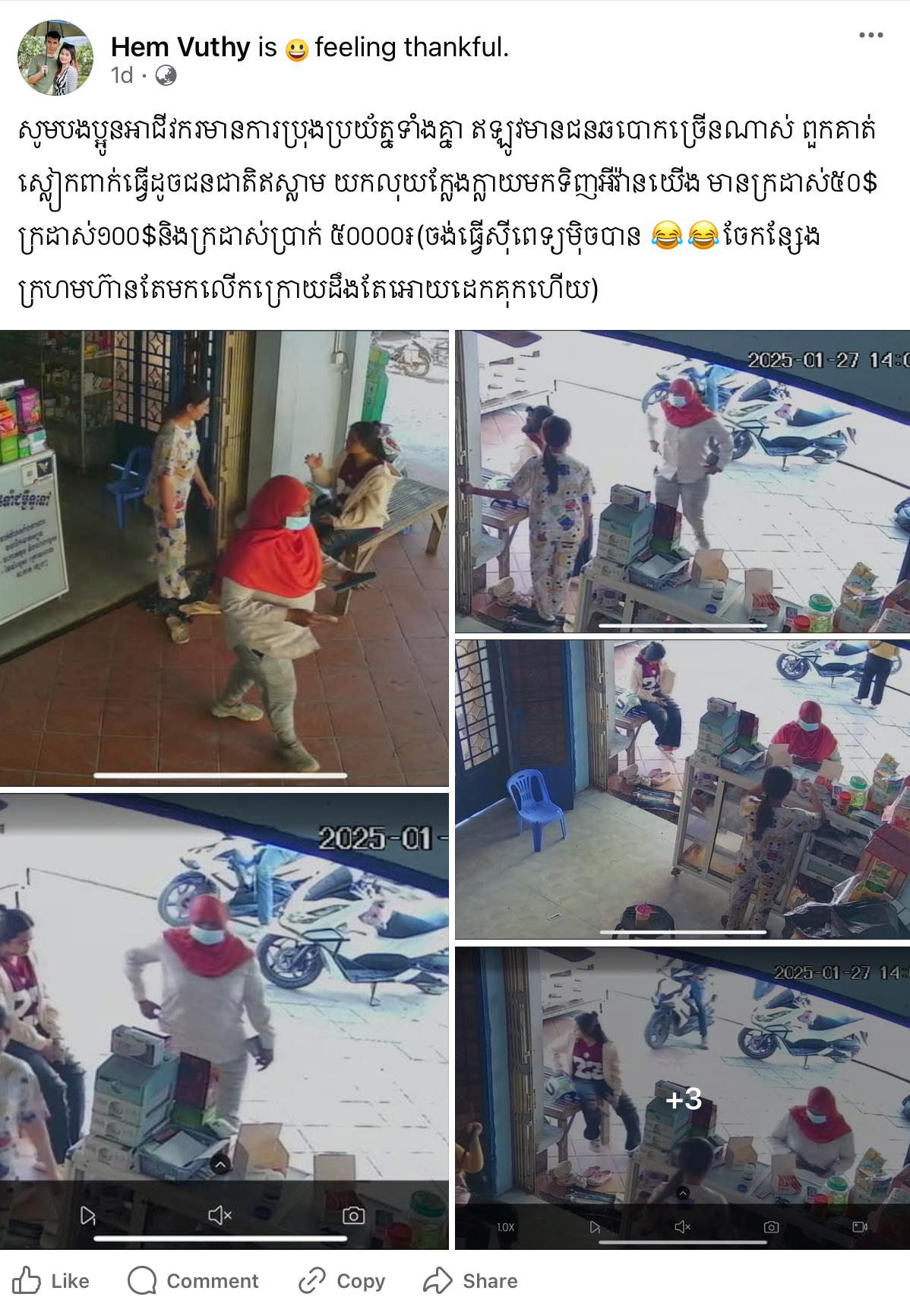 ជាក់ស្ដែងតាមរយៈគណនីដែលមានឈ្មោះ Hem Vuthy បានបង្ហោះសារភ្ជាប់ជាមួយនឹងរូបភាពនៅថ្ងៃទី ២៩ ខែមករា ឆ្នាំ ២០២៥ ណែនាំឱ្យបងប្អូនអាជីវករមានការប្រុងប្រយ័ត្នទាំងគ្នា ដោយមានជនឆបោក បានបន្លំស្លៀកពាក់ធ្វើដូចជនជាតិឥស្លាម យកលុយក្លែងក្លាយមកទិញអីវ៉ាន់ មានក្រដាស ៥០$ ក្រដាស ១០០$ និង ក្រដាសប្រាក់ ៥០ ០០០ រៀល។