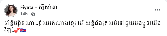 ជាក់ស្តែង នៅសល់ត្រឹម ១ សប្តាហ៍ទៀតប៉ុណ្ណោះ ការប្រកួតវគ្គផ្តាច់ព្រ័ត្រក៏បានមកដល់នោះ ស្រាប់តែនៅព្រឹកថ្ងៃទី ១៣ ខែវិច្ឆិកា ឆ្នាំ ២០២៥ នេះ អ្នកនាង ហ្វីយ៉ាតា បានបង្ហោះសារយ៉ាងខ្លី តែមានអត្ថន័យយ៉ាងខ្លាំងសម្រាប់ប្រទេសកម្ពុជាថា៖ «ចាំខ្ញុំបន្តិចណា! ខ្ញុំឈរតំណាងខ្មែរ ហើយខ្ញុំនឹងត្រឡប់ទៅជួយបងប្អូនយើងវិញ»៕