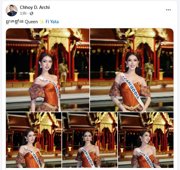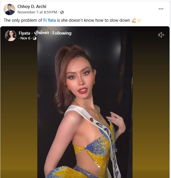 យ៉ាងណាមិញ ក្រៅពីមហាជនអ្នកគាំទ្រ បើងាកទៅមើលហ្វេសប៊ុករបស់អ្នកគ្រប់គ្រងស្ថាប័ន Miss Universe Cambodia វិញ គឺលោក Chhoy D. Archi ក៏តែងឈរនៅក្រោយបវរកញ្ញារបស់ខ្លួនដែរ គឺលោកតែងចែករំលែកពីបវរកញ្ញា ហ្វីយ៉ាតា ដោយបង្ហាញការលើកទឹកចិត្តគាំទ្ររាល់សកម្មភាពរបស់នាងពេញដោយក្ដីមោទកភាព ចំពោះភាពរឹងមាំមោះមុតរបស់ ហ្វីយ៉ាតា ក្នុងដំណើរការប្រកួតលើឆាកអន្តរជាតិនេះផងដែរ៕