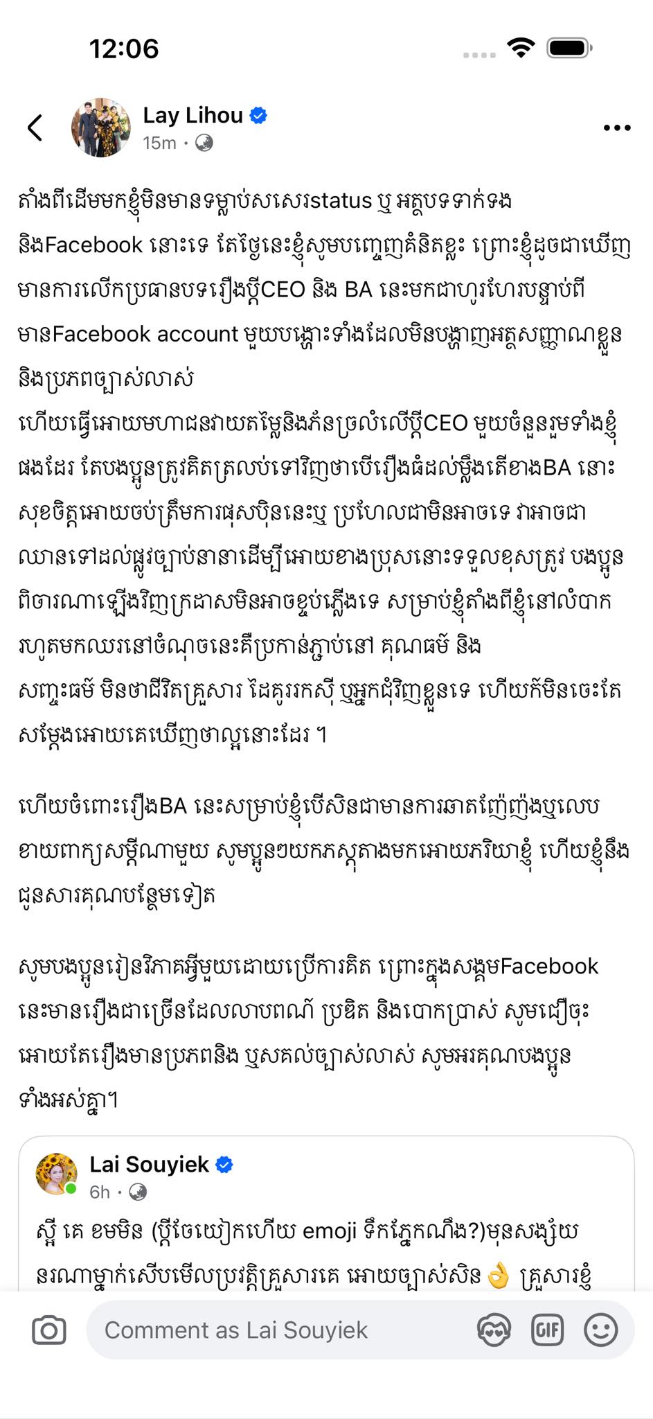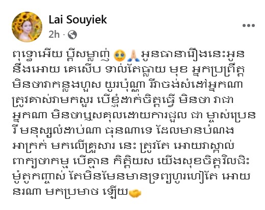 ងាកទៅកាន់ ចែយៀក ក៏បានបង្ហោះសារថ្មីយ៉ាងក្ដៅគគុក ខណៈមានអ្នកទាញយកឈ្មោះស្វាមីរបស់ខ្លួនទៅចូលរឿងខាងលើ។ ការបង្ហោះថ្មីនោះ ចែយៀក បានរៀបរាប់យ៉ាងច្បាស់ថា៖ «ពុទ្ធោអេីយ ប្តីសម្លាញ់ អូនធានារឿងនេះអូននឹងឱ្យគេស៊ើបទាល់តែធ្លាយមុខអ្នកប្រព្រឹត្ត មិនថាវាកន្លងហួសយូរប៉ុនណា ឬវាចង់សំដៅអ្នកណា ត្រូវគាស់វាមកសួរ បេីខ្ញុំដាក់ចិត្តធ្វេី មិនថា វាជាអ្នកណា មិនថាឬសគុលដោយការជួល ជា ម្ចាស់ប្រេន ឬ មនុស្សលំដាប់ណា ធន់ណាទេ ដែលមានបំណងអាក្រក់ មកលេីគ្រួសារនេះ ត្រូវតែឱ្យវាស្គាល់ពាក្យថាកម្ម បេីគ្មាន កិត្តិយស យេីងសុខចិត្តវិលជិះម៉ូតូកញ្ចាស់ តែមិនមែនមានទ្រព្យហូរហៀរតែឱ្យនរណាមកប្រមាថឡេីយ»៕