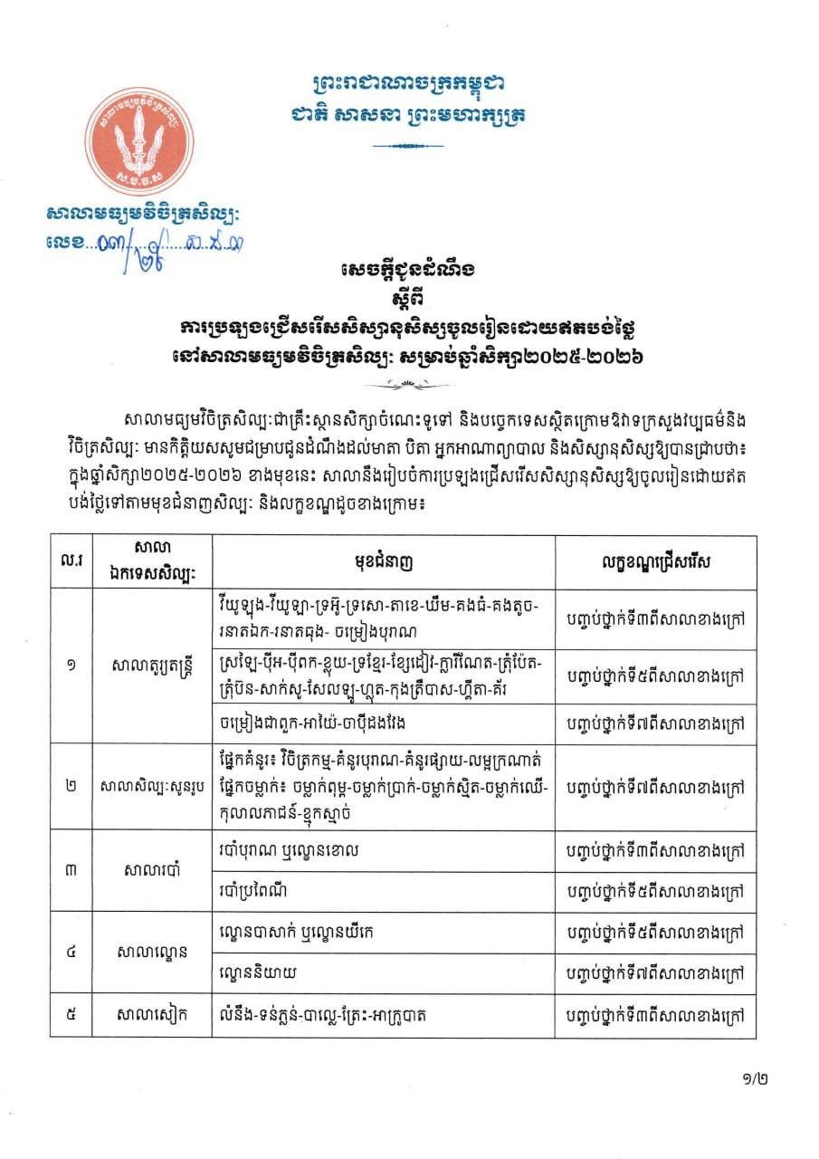 នៅថ្ងៃទី ០២ ខែតុលា ឆ្នាំ ២០២៥ នេះ សាលាមធ្យមវិចិត្រសិល្បៈ បានចេញសេចក្តីជូនដំណឹងឱ្យបានដឹងថា ក្នុងឆ្នាំសិក្សា ២០២៥-២០២៦ ខាងមុខនេះ សាលានឹងរៀបចំការប្រឡងជ្រើសរើសសិស្សានុសិស្សឱ្យចូលរៀនដោយឥតបង់ថ្លៃ ទៅតាមមុខជំនាញសិល្បៈ និង លក្ខខណ្ឌមួយចំនួន។
