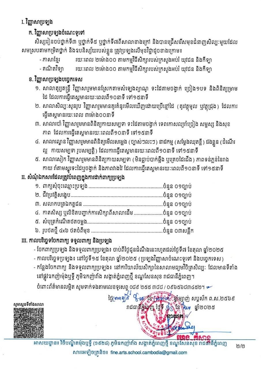 គួរឱ្យដឹងថា ខាងសាលាចែកពាក្យប្រឡង និង ទទួលពាក្យប្រឡងចាប់ពីថ្ងៃជូនដំណឹងនេះ រហូតដល់ថ្ងៃទី ៧ ខែតុលា ឆ្នាំ ២០២៥ ខណៈកាលបរិច្ឆេទប្រឡងធ្វើឡើងនៅថ្ងៃទី ១៥ ខែតុលា ឆ្នាំ ២០២៥ (ប្រឡងវិញ្ញាសាចំណេះទូទៅ និង បច្ចេកទេស)។ ចំពោះកន្លែងចែកពាក្យ និង ទទួលពាក្យប្រឡង គឺនៅការិយាល័យសិក្សានៃសាលាមធ្យមវិចិត្រសិល្បៈ ដែលមានទីតាំងនៅផ្លូវឧកញ៉ាម៉ុងឫទ្ធី ភូមិឧកញ៉ាវាំង សង្កាត់ភ្នំពេញថ្មី ខណ្ឌសែនសុខ រាជធានីភ្នំពេញ។ ចំពោះព័ត៌មានលម្អិត សូមទាក់ទងតាមលេខទូរសព្ទ ០៨៩ ២៥៥ ៣៨៨/០៩៦៥៦៨៣៤៥២៕