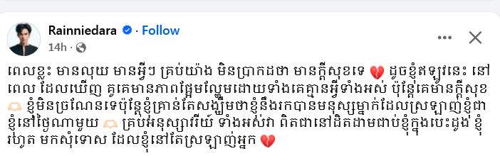 ជាក់ស្តែង នៅថ្ងៃទី ០៧ ខែតុលា ឆ្នាំ ២០២៥ កន្លងទៅនេះ លោក Rannie Dara បានបង្ហោះរូបភាព អមនឹងសារជាថ្មីថា៖ «ពេលខ្លះ មានលុយ មានអ្វីៗ គ្រប់យ៉ាង មិនប្រាកដថា មានក្តីសុខទេ! ដូចខ្ញុំឥឡូវនេះ នៅពេល ដែលឃើញគូគេមានភាពផ្អែមល្ហែមដោយទាំងគេគ្មានអ្វីទាំងអស់ ប៉ុន្តែគេមានក្តីសុខ ខ្ញុំមិនច្រណែនទេ ប៉ុន្តែខ្ញុំគ្រាន់តែសង្ឃឹមថា ខ្ញុំនឹងរកបានមនុស្សម្នាក់ ដែលស្រឡាញ់ខ្ញុំជាខ្ញុំនៅថ្ងៃណាមួយ។ គ្រប់អនុស្សាវរីយ៍ទាំងអស់ វាពិតជានៅដិតដាមជាប់ខ្ញុំក្នុងបេះដូងខ្ញុំរហូតមក! សុំទោស ដែលខ្ញុំនៅតែស្រឡាញ់អ្នក»៕