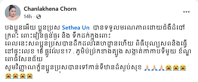 កាលពីថ្ងៃទី ១៩ ខែវិច្ឆិកា ឆ្នាំ ២០២៥ កន្លងទៅនេះ អ្នកលេងបណ្តាញសង្គមហ្វេសប៊ុក ជាពិសេស សិល្បករ សិល្បការិនីជាច្រើន បានបង្ហាញក្តីរន្ធត់ចិត្តបន្ទាប់ពីទទួលបានដំណឹងមរណភាពរបស់លោក អ៊ុន សិទ្ធា ដែលជាតារាបង្ហាញម៉ូដ ពិធីករ និង តារាសម្តែងដ៏មានប្រជាប្រិយភាពមួយរូប។