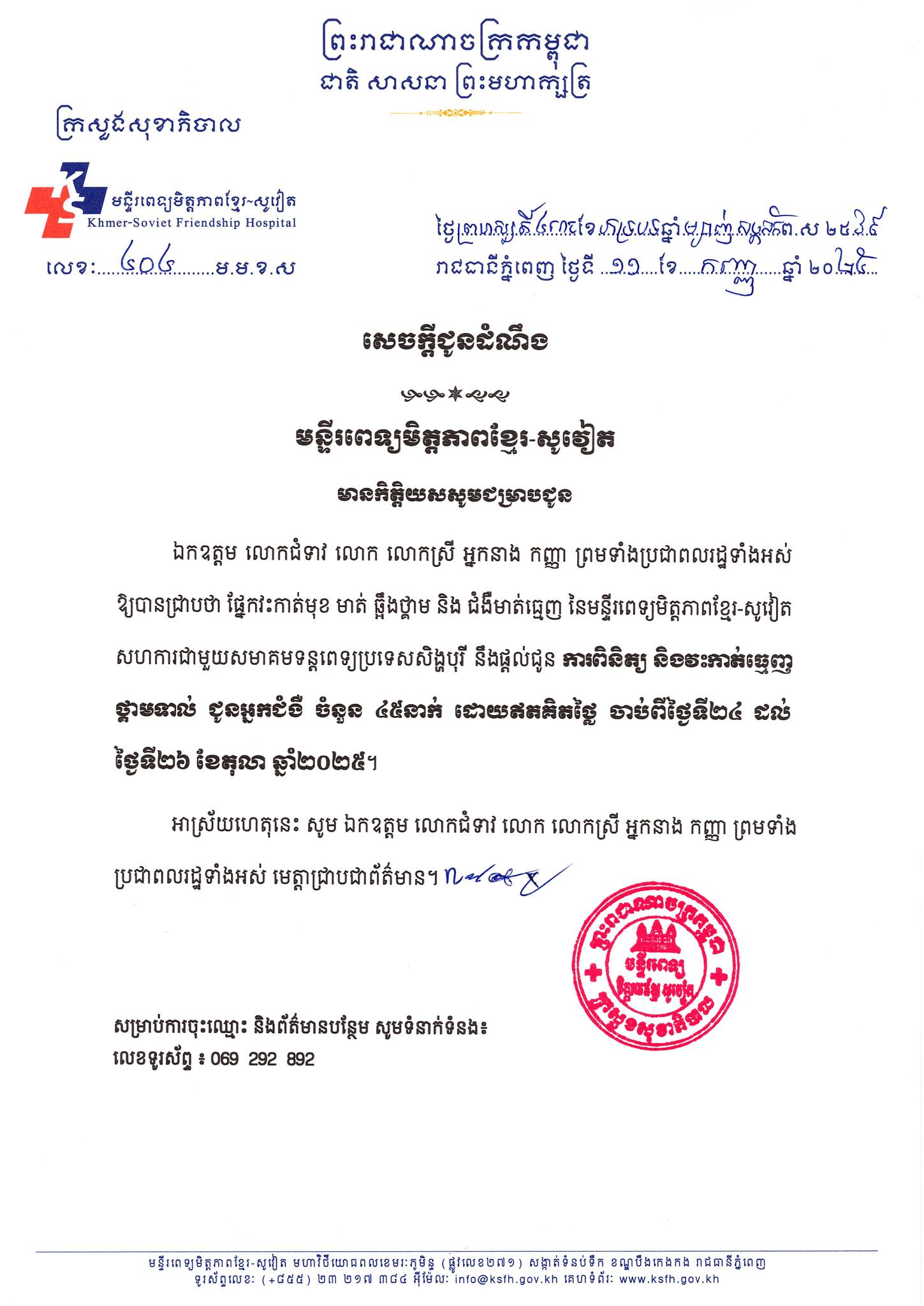 ការផ្ដល់ជូនការពិនិត្យ និង វះកាត់ធ្មេញ ថ្គាមទាល់ ជូនអ្នកជំងឺ ចំនួន ៤៥ នាក់ ដោយឥតគិតថ្លៃនេះ នឹងធ្វើឡើងចាប់ពីថ្ងៃទី ២៤ ដល់ ថ្ងៃទី ២៦ ខែតុលា ឆ្នាំ ២០២៥។