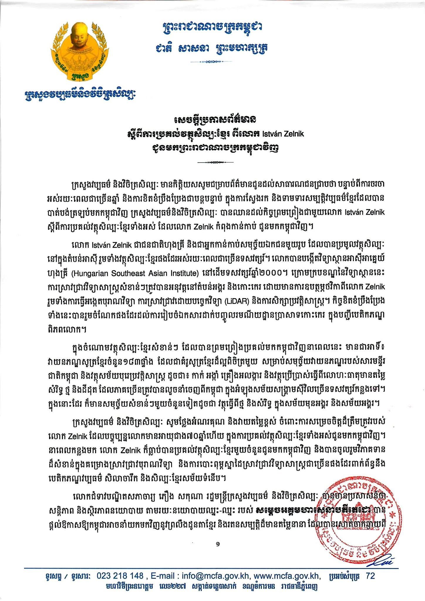នៅថ្ងៃទី ២០ ខែវិច្ឆិកា ឆ្នាំ ២០២៥ ក្រសួងវប្បធម៌ និង វិចិត្រសិល្បៈ បានចេញសេចក្តីប្រកាសព័ត៌មានឱ្យបានដឹងថា បន្ទាប់ពីការចរចាអស់រយៈពេលជាច្រើនឆ្នាំ និង ការខិតខំប្រឹងប្រែងជាបន្តបន្ទាប់ ក្នុងការស្វែងរក និង ទាមទារសម្បត្តិវប្បធម៌ខ្មែរដែលបានបាត់បង់ត្រឡប់មកកម្ពុជាវិញ ក្រសួងវប្បធម៌ បានឈានដល់កិច្ចព្រមព្រៀងជាមួយលោក István Zelnik ស្តីពីការប្រគល់វត្ថុសិល្បៈខ្មែរទាំងអស់ ដែលលោក Zelnik កំពុងកាន់កាប់ ជូនមកកម្ពុជាវិញ។